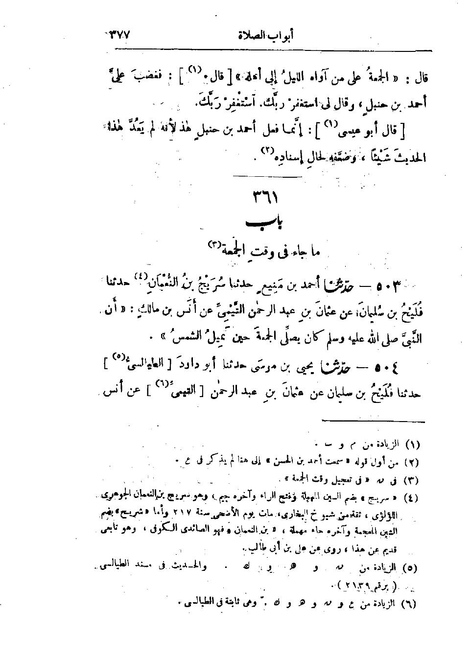 503 - حَدَّثَنَا أَحْمَدُ بْنُ مَنِيعٍ قَالَ: حَدَّثَنَا سُرَيْجُ بْنُ النُّعْمَانِ قَالَ: حَدَّثَنَا فُلَيْحُ بْنُ سُلَيْمَانَ، عَنْ عُثْمَانَ بْنِ عَبْدِ الرَّحْمَنِ التَّيْمِيِّ، عَنْ أَنَسِ بْنِ مَالِكٍ، «أَنَّ النَّبِيَّ صَلَّى اللَّهُ عَلَيْهِ وَسَلَّمَ كَانَ §يُصَلِّي الجُمُعَةَ حِينَ تَمِيلُ الشَّمْسُ»