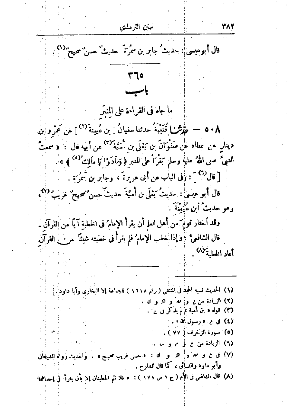 508 - حَدَّثَنَا قُتَيْبَةُ قَالَ: حَدَّثَنَا سُفْيَانُ بْنُ عُيَيْنَةَ، عَنْ عَمْرِو بْنِ دِينَارٍ، عَنْ عَطَاءٍ، عَنْ صَفْوَانَ بْنِ يَعْلَى بْنِ أُمَيَّةَ، عَنْ أَبِيهِ، قَالَ: سَمِعْتُ النَّبِيَّ صَلَّى اللَّهُ عَلَيْهِ وَسَلَّمَ " §يَقْرَأُ عَلَى المِنْبَرِ: {وَنَادَوْا يَا مَالِكُ} [الزخرف: 77] " وَفِي البَابِ عَنْ أَبِي هُرَيْرَةَ، وَجَابِرِ بْنِ سَمُرَةَ: «حَدِيثُ يَعْلَى بْنِ أُمَيَّةَ حَدِيثٌ حَسَنٌ صَحِيحٌ غَرِيبٌ، وَهُوَ حَدِيثُ ابْنِ عُيَيْنَةَ»، " وَقَدْ اخْتَارَ قَوْمٌ مِنْ أَهْلِ العِلْمِ: أَنْ يَقْرَأَ الإِمَامُ فِي الخُطْبَةِ آيًا مِنَ القُرْآنِ " قَالَ الشَّافِعِيُّ: «وَإِذَا خَطَبَ الإِمَامُ فَلَمْ يَقْرَأْ فِي خُطْبَتِهِ شَيْئًا مِنَ القُرْآنِ أَعَادَ الخُطْبَةَ»