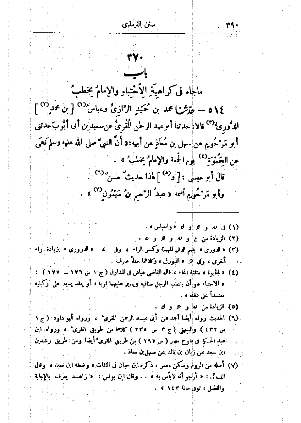 514 - حَدَّثَنَا مُحَمَّدُ بْنُ حُمَيْدٍ الرَّازِيُّ، وَالْعَبَّاسُ بْنُ مُحَمَّدٍ الدُّورِيُّ، قَالَا: حَدَّثَنَا أَبُو عَبْدِ الرَّحْمَنِ المُقْرِئُ، عَنْ سَعِيدِ بْنِ أَبِي أَيُّوبَ قَالَ: حَدَّثَنِي أَبُو مَرْحُومٍ، عَنْ سَهْلِ بْنِ مُعَاذٍ، عَنْ أَبِيهِ، «أَنَّ النَّبِيَّ صَلَّى اللَّهُ عَلَيْهِ وَسَلَّمَ §نَهَى عَنِ الحِبْوَةَ يَوْمَ الجُمُعَةِ وَالإِمَامُ يَخْطُبُ»: «وَهَذَا حَدِيثٌ حَسَنٌ»، «وَأَبُو مَرْحُومٍ اسْمُهُ عَبْدُ الرَّحِيمِ بْنُ مَيْمُونٍ» -[391]- وَقَدْ كَرِهَ قَوْمٌ مِنْ أَهْلِ العِلْمِ الحِبْوَةَ يَوْمَ الجُمُعَةِ وَالإِمَامُ يَخْطُبُ، وَرَخَّصَ فِي ذَلِكَ بَعْضُهُمْ مِنْهُمْ: عَبْدُ اللَّهِ بْنُ عُمَرَ، وَغَيْرُهُ، وَبِهِ يَقُولُ أَحْمَدُ، وَإِسْحَاقُ لَا يَرَيَانِ بِالحِبْوَةِ وَالإِمَامُ يَخْطُبُ بَأْسًا "