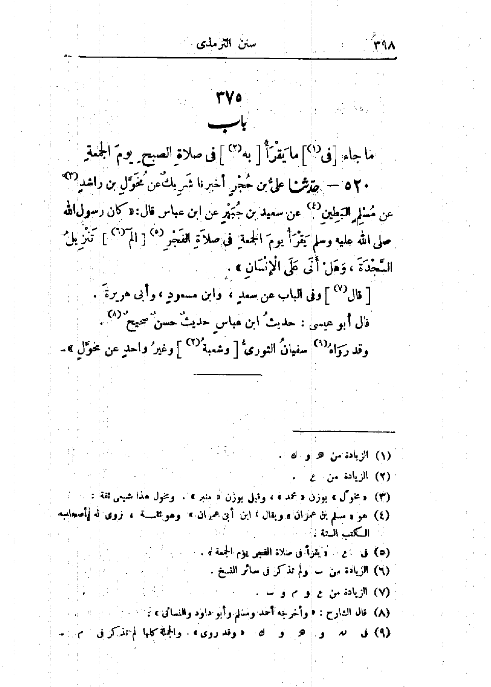 520 - حَدَّثَنَا عَلِيُّ بْنُ حُجْرٍ قَالَ: أَخْبَرَنَا شَرِيكٌ، عَنْ مُخَوَّلِ بْنِ رَاشِدٍ، عَنْ مُسْلِمٍ البَطِينِ، عَنْ سَعِيدِ بْنِ جُبَيْرٍ، عَنْ ابْنِ عَبَّاسٍ، قَالَ: " كَانَ رَسُولُ اللَّهِ صَلَّى اللَّهُ عَلَيْهِ وَسَلَّمَ §يَقْرَأُ يَوْمَ الجُمُعَةِ فِي صَلَاةِ الفَجْرِ: تَنْزِيلُ السَّجْدَةَ، وَهَلْ أَتَى عَلَى الإِنْسَانِ " وَفِي البَابِ عَنْ سَعْدٍ، وَابْنِ مَسْعُودٍ، وَأَبِي هُرَيْرَةَ: «حَدِيثُ ابْنِ عَبَّاسٍ حَدِيثٌ حَسَنٌ صَحِيحٌ»، وَقَدْ رَوَى سُفْيَانُ الثَّوْرِيُّ، وَغَيْرُ وَاحِدٍ عَنْ مُخَوَّلٍ
