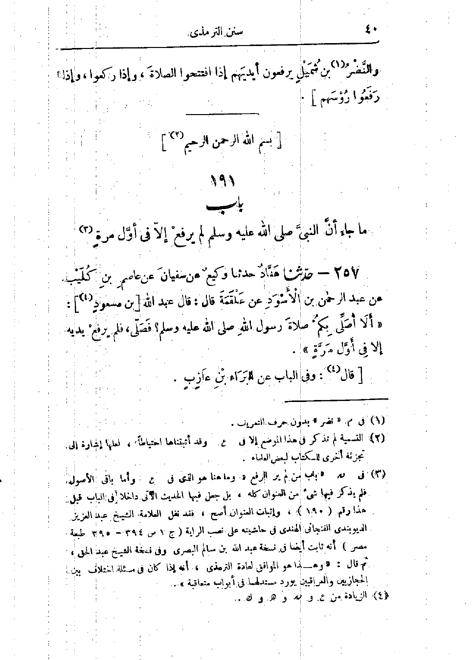 257 - حَدَّثَنَا هَنَّادٌ قَالَ: حَدَّثَنَا وَكِيعٌ، عَنْ سُفْيَانَ، عَنْ عَاصِمِ بْنِ كُلَيْبٍ، عَنْ عَبْدِ الرَّحْمَنِ بْنِ الأَسْوَدِ، عَنْ عَلْقَمَةَ، قَالَ: قَالَ عَبْدُ اللَّهِ بْنُ مَسْعُودٍ: «أَلَا أُصَلِّي بِكُمْ صَلَاةَ رَسُولِ اللَّهِ صَلَّى اللَّهُ عَلَيْهِ وَسَلَّمَ؟ §فَصَلَّى، فَلَمْ يَرْفَعْ يَدَيْهِ إِلَّا فِي أَوَّلِ مَرَّةٍ». وَفِي البَابِ عَنْ البَرَاءِ بْنِ عَازِبٍ. -[41]- حَدِيثُ ابْنِ مَسْعُودٍ حَدِيثٌ حَسَنٌ، -[42]- وَبِهِ يَقُولُ غَيْرُ وَاحِدٍ مِنْ أَهْلِ العِلْمِ مِنْ أَصْحَابِ النَّبِيِّ صَلَّى اللَّهُ عَلَيْهِ وَسَلَّمَ، وَالتَّابِعِينَ، -[43]- وَهُوَ قَوْلُ سُفْيَانَ الثَّوْرِيِّ، وَأَهْلِ الكُوفَةِ