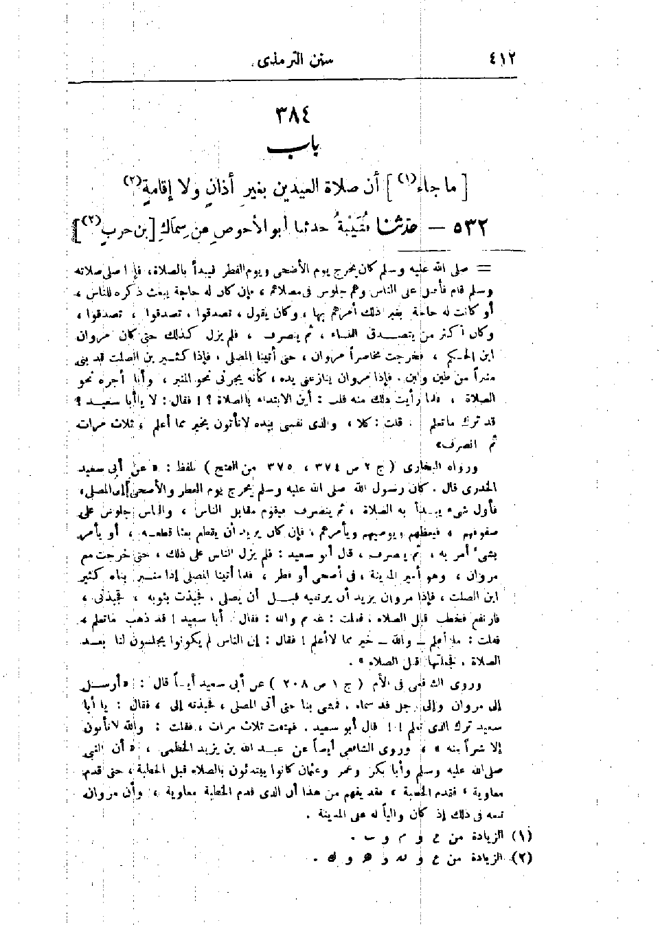 532 - حَدَّثَنَا قُتَيْبَةُ قَالَ: حَدَّثَنَا أَبُو الأَحْوَصِ، عَنْ سِمَاكِ بْنِ حَرْبٍ، -[413]- عَنْ جَابِرِ بْنِ سَمُرَةَ، قَالَ: «§صَلَّيْتُ مَعَ النَّبِيِّ صَلَّى اللَّهُ عَلَيْهِ وَسَلَّمَ العِيدَيْنِ غَيْرَ مَرَّةٍ وَلَا مَرَّتَيْنِ بِغَيْرِ أَذَانٍ وَلَا إِقَامَةٍ» وَفِي البَابِ عَنْ جَابِرِ بْنِ عَبْدِ اللَّهِ، وَابْنِ عَبَّاسٍ: «وَحَدِيثُ جَابِرِ بْنِ سَمُرَةَ حَدِيثٌ حَسَنٌ صَحِيحٌ»، " وَالعَمَلُ عَلَيْهِ عِنْدَ أَهْلِ العِلْمِ مِنْ أَصْحَابِ النَّبِيِّ صَلَّى اللَّهُ عَلَيْهِ وَسَلَّمَ وَغَيْرِهِمْ أَنَّهُ: لَا يُؤَذَّنُ لِصَلَاةِ العِيدَيْنِ وَلَا لِشَيْءٍ مِنَ النَّوَافِلِ "