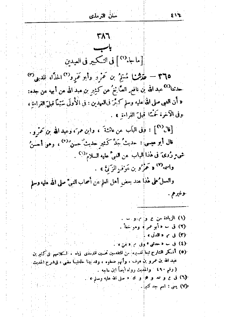 536 - حَدَّثَنَا مُسْلِمُ بْنُ عَمْرٍو أَبُو عَمْرٍو الحَذَّاءُ المَدِينِيُّ قَالَ: حَدَّثَنَا عَبْدُ اللَّهِ بْنُ نَافِعٍ الصَّائِغُ، عَنْ كَثِيرِ بْنِ عَبْدِ اللَّهِ، عَنْ أَبِيهِ، عَنْ جَدِّهِ، «أَنَّ النَّبِيَّ صَلَّى اللَّهُ عَلَيْهِ وَسَلَّمَ §كَبَّرَ فِي العِيدَيْنِ فِي الأُولَى سَبْعًا قَبْلَ القِرَاءَةِ، وَفِي الآخِرَةِ خَمْسًا قَبْلَ القِرَاءَةِ» وَفِي البَابِ عَنْ عَائِشَةَ، وَابْنِ عُمَرَ، وَعَبْدِ اللَّهِ بْنِ عَمْرٍو. حَدِيثُ جَدِّ كَثِيرٍ حَدِيثٌ حَسَنٌ، وَهُوَ أَحْسَنُ شَيْءٍ رُوِيَ فِي هَذَا البَابِ عَنِ النَّبِيِّ صَلَّى اللَّهُ عَلَيْهِ وَسَلَّمَ، وَاسْمُهُ عَمْرُو بْنُ عَوْفٍ المُزَنِيُّ، وَالعَمَلُ عَلَى هَذَا عِنْدَ بَعْضِ أَهْلِ العِلْمِ مِنْ أَصْحَابِ النَّبِيِّ صَلَّى اللَّهُ عَلَيْهِ وَسَلَّمَ، وَغَيْرِهِمْ، -[417]- وَهَكَذَا رُوِيَ عَنْ أَبِي هُرَيْرَةَ أَنَّهُ صَلَّى بِالمَدِينَةِ نَحْوَ هَذِهِ الصَّلَاةِ، وَهُوَ قَوْلُ أَهْلِ المَدِينَةِ وَبِهِ يَقُولُ مَالِكُ بْنُ أَنَسٍ، وَالشَّافِعِيُّ، وَأَحْمَدُ، وَإِسْحَاقُ، وَرُوِي عَنِ ابْنِ مَسْعُودٍ، أَنَّهُ قَالَ فِي التَّكْبِيرِ فِي العِيدَيْنِ: " تِسْعَ تَكْبِيرَاتٍ فِي الرَّكْعَةِ الأُولَى: خَمْسًا قَبْلَ القِرَاءَةِ، وَفِي الرَّكْعَةِ الثَّانِيَةِ يَبْدَأُ بِالقِرَاءَةِ ثُمَّ يُكَبِّرُ أَرْبَعًا مَعَ تَكْبِيرَةِ الرُّكُوعِ " وَقَدْ رُوِيَ عَنْ غَيْرِ وَاحِدٍ مِنْ أَصْحَابِ النَّبِيِّ صَلَّى اللَّهُ عَلَيْهِ وَسَلَّمَ نَحْوُ هَذَا، وَهُوَ قَوْلُ أَهْلِ الكُوفَةِ، وَبِهِ يَقُولُ سُفْيَانُ الثَّوْرِيُّ