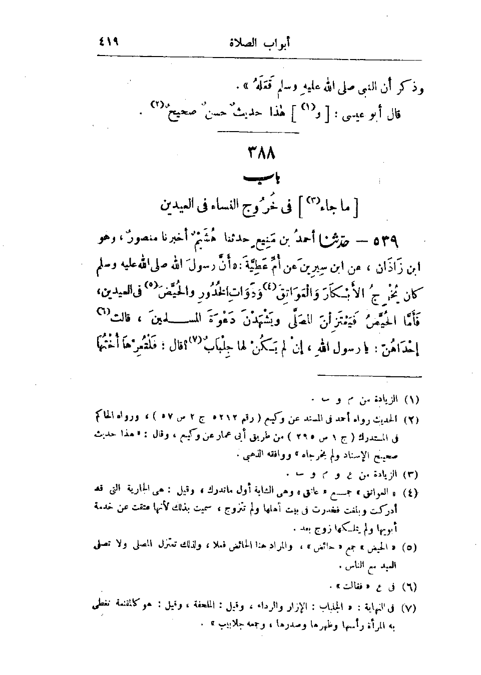 539 - حَدَّثَنَا أَحْمَدُ بْنُ مَنِيعٍ قَالَ: حَدَّثَنَا هُشَيْمٌ قَالَ: أَخْبَرَنَا مَنْصُورٌ وَهُوَ ابْنُ زَاذَانَ، عَنْ ابْنِ سِيرِينَ، عَنْ أُمِّ عَطِيَّةَ، «أَنَّ رَسُولَ اللَّهِ صَلَّى اللَّهُ عَلَيْهِ وَسَلَّمَ كَانَ §يُخْرِجُ الأَبْكَارَ، وَالعَوَاتِقَ، وَذَوَاتِ الخُدُورِ، وَالحُيَّضَ فِي العِيدَيْنِ»، فَأَمَّا الحُيَّضُ فَيَعْتَزِلْنَ المُصَلَّى، وَيَشْهَدْنَ دَعْوَةَ المُسْلِمِينَ، قَالَتْ إِحْدَاهُنَّ: يَا رَسُولَ اللَّهِ، إِنْ لَمْ يَكُنْ لَهَا جِلْبَابٌ، قَالَ: «فَلْتُعِرْهَا أُخْتُهَا -[420]- مِنْ جَلَابِيبِهَا»،