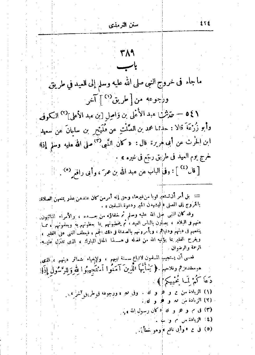 541 - حَدَّثَنَا عَبْدُ الأَعْلَى بْنُ وَاصِلِ بْنِ عَبْدِ الأَعْلَى الكُوفِيُّ، وَأَبُو زُرْعَةَ، قَالَا: حَدَّثَنَا مُحَمَّدُ بْنُ الصَّلْتِ، عَنْ فُلَيْحِ بْنِ سُلَيْمَانَ، عَنْ سَعِيدِ بْنِ الحَارِثِ، عَنْ أَبِي هُرَيْرَةَ، قَالَ: «كَانَ النَّبِيُّ صَلَّى اللَّهُ عَلَيْهِ وَسَلَّمَ §إِذَا خَرَجَ يَوْمَ العِيدِ فِي طَرِيقٍ رَجَعَ فِي غَيْرِهِ» وَفِي البَابِ عَنْ عَبْدِ اللَّهِ بْنِ عُمَرَ، وَأَبِي رَافِعٍ: -[425]- «حَدِيثُ أَبِي هُرَيْرَةَ حَدِيثٌ حَسَنٌ غَرِيبٌ» وَرَوَى أَبُو تُمَيْلَةَ، وَيُونُسُ بْنُ مُحَمَّدٍ هَذَا الحَدِيثَ، عَنْ فُلَيْحِ بْنِ سُلَيْمَانَ، عَنْ سَعِيدِ بْنِ الحَارِثِ، عَنْ جَابِرِ بْنِ عَبْدِ اللَّهِ «وَقَدْ اسْتَحَبَّ بَعْضُ أَهْلِ العِلْمِ لِلإِمَامِ إِذَا خَرَجَ فِي طَرِيقٍ أَنْ -[426]- يَرْجِعَ فِي غَيْرِهِ اتِّبَاعًا لِهَذَا الحَدِيثِ، وَهُوَ قَوْلُ الشَّافِعِيِّ، وَحَدِيثُ جَابِرٍ كَأَنَّهُ أَصَحُّ»