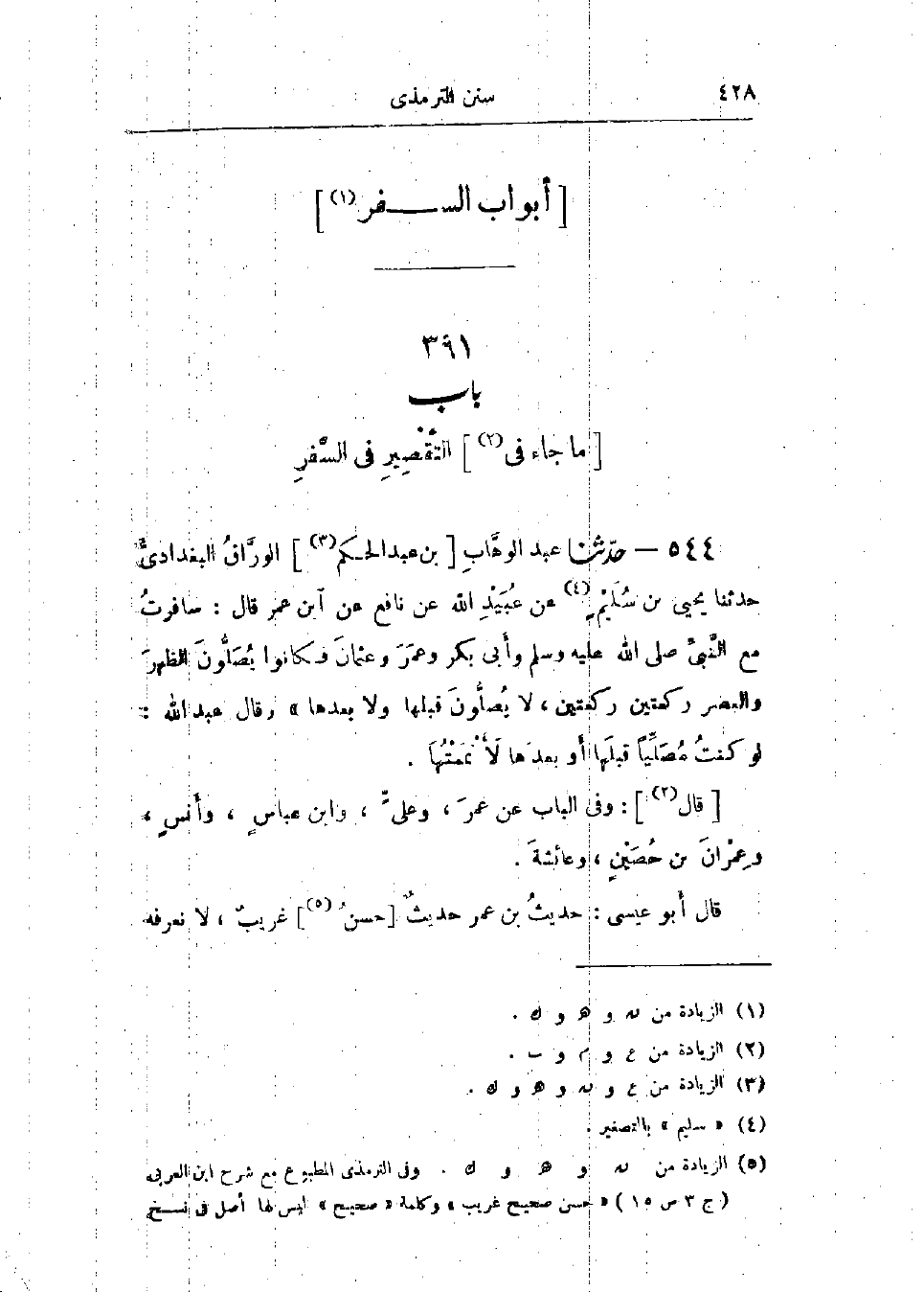 544 - حَدَّثَنَا عَبْدُ الوَهَّابِ بْنُ عَبْدِ الحَكَمِ الوَرَّاقُ البَغْدَادِيُّ قَالَ: حَدَّثَنَا يَحْيَى بْنُ سُلَيْمٍ، عَنْ عُبَيْدِ اللَّهِ، عَنْ نَافِعٍ، عَنْ ابْنِ عُمَرَ، قَالَ: «سَافَرْتُ مَعَ النَّبِيِّ صَلَّى اللَّهُ عَلَيْهِ وَسَلَّمَ وَأَبِي بَكْرٍ، وَعُمَرَ، وَعُثْمَانَ فَكَانُوا §يُصَلُّونَ الظُّهْرَ وَالعَصْرَ رَكْعَتَيْنِ رَكْعَتَيْنِ، لَا يُصَلُّونَ قَبْلَهَا وَلَا بَعْدَهَا»، وقَالَ عَبْدُ اللَّهِ: «لَوْ كُنْتُ مُصَلِّيًا قَبْلَهَا أَوْ بَعْدَهَا لَأَتْمَمْتُهَا» وَفِي البَابِ عَنْ عُمَرَ، وَعَلِيٍّ، وَابْنِ عَبَّاسٍ، وَأَنَسٍ، وَعِمْرَانَ بْنِ حُصَيْنٍ، وَعَائِشَةَ: «حَدِيثُ ابْنِ عُمَرَ حَدِيثٌ حَسَنٌ غَرِيبٌ لَا نَعْرِفُهُ -[429]- إِلَّا مِنْ حَدِيثِ يَحْيَى بْنِ سُلَيْمٍ، مِثْلَ هَذَا» وَقَالَ مُحَمَّدُ بْنُ إِسْمَاعِيلَ: وَقَدْ رُوِيَ هَذَا الحَدِيثُ، عَنْ عُبَيْدِ اللَّهِ بْنِ عُمَرَ، عَنْ رَجُلٍ مِنْ آلِ سُرَاقَةَ، عَنْ عَبْدِ اللَّهِ بْنِ عُمَرَ: وَقَدْ رُوِيَ عَنْ عَطِيَّةَ العَوْفِيِّ، عَنْ ابْنِ عُمَرَ «أَنَّ النَّبِيَّ صَلَّى اللَّهُ عَلَيْهِ وَسَلَّمَ كَانَ يَتَطَوَّعُ فِي السَّفَرِ قَبْلَ الصَّلَاةِ وَبَعْدَهَا -[430]-» وَقَدْ صَحَّ عَنِ النَّبِيِّ صَلَّى اللَّهُ عَلَيْهِ وَسَلَّمَ أَنَّهُ كَانَ يَقْصُرُ فِي السَّفَرِ وَأَبُو بَكْرٍ، وَعُمَرُ، وَعُثْمَانُ، صَدْرًا مِنْ خِلَافَتِهِ. «وَالعَمَلُ عَلَى هَذَا عِنْدَ أَكْثَرِ أَهْلِ العِلْمِ مِنْ أَصْحَابِ النَّبِيِّ صَلَّى اللَّهُ عَلَيْهِ وَسَلَّمَ وَغَيْرِهِمْ» وَقَدْ رُوِيَ عَنْ عَائِشَةَ «أَنَّهَا كَانَتْ تُتِمُّ الصَّلَاةَ فِي السَّفَرِ» وَالعَمَلُ عَلَى مَا رُوِيَ عَنِ النَّبِيِّ صَلَّى اللَّهُ عَلَيْهِ وَسَلَّمَ وَأَصْحَابِهِ، وَهُوَ قَوْلُ الشَّافِعِيِّ، وَأَحْمَدَ، وَإِسْحَاقَ، إِلَّا أَنَّ الشَّافِعِيَّ يَقُولُ: التَّقْصِيرُ رُخْصَةٌ لَهُ فِي السَّفَرِ فَإِنْ أَتَمَّ الصَّلَاةَ أَجْزَأَ عَنْهُ "
