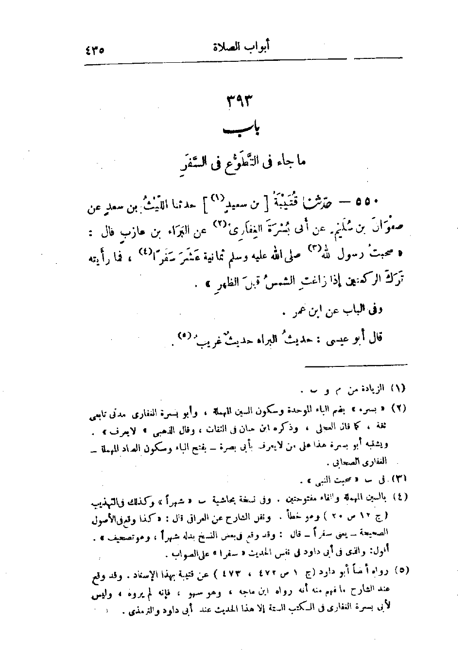 550 - حَدَّثَنَا قُتَيْبَةُ قَالَ: حَدَّثَنَا اللَّيْثُ بْنُ سَعْدٍ، عَنْ صَفْوَانَ بْنِ سُلَيْمٍ، عَنْ أَبِي بُسْرَةَ الغِفَارِيِّ، عَنْ البَرَاءِ بْنِ عَازِبٍ، قَالَ: «§صَحِبْتُ رَسُولَ اللَّهِ صَلَّى اللَّهُ عَلَيْهِ وَسَلَّمَ ثَمَانِيَةَ عَشَرَ سَفَرًا، فَمَا رَأَيْتُهُ تَرَكَ الرَّكْعَتَيْنِ إِذَا زَاغَتِ الشَّمْسُ قَبْلَ الظُّهْرِ» وَفِي البَابِ عَنْ ابْنِ عُمَرَ،: «حَدِيثُ البَرَاءِ حَدِيثٌ غَرِيبٌ -[436]-» وَسَأَلْتُ مُحَمَّدًا عَنْهُ فَلَمْ يَعْرِفْهُ، إِلَّا مِنْ حَدِيثِ اللَّيْثِ بْنِ سَعْدٍ، وَلَمْ يَعْرِفْ اسْمَ أَبِي بُسْرَةَ الغِفَارِيِّ وَرَآهُ حَسَنًا "
