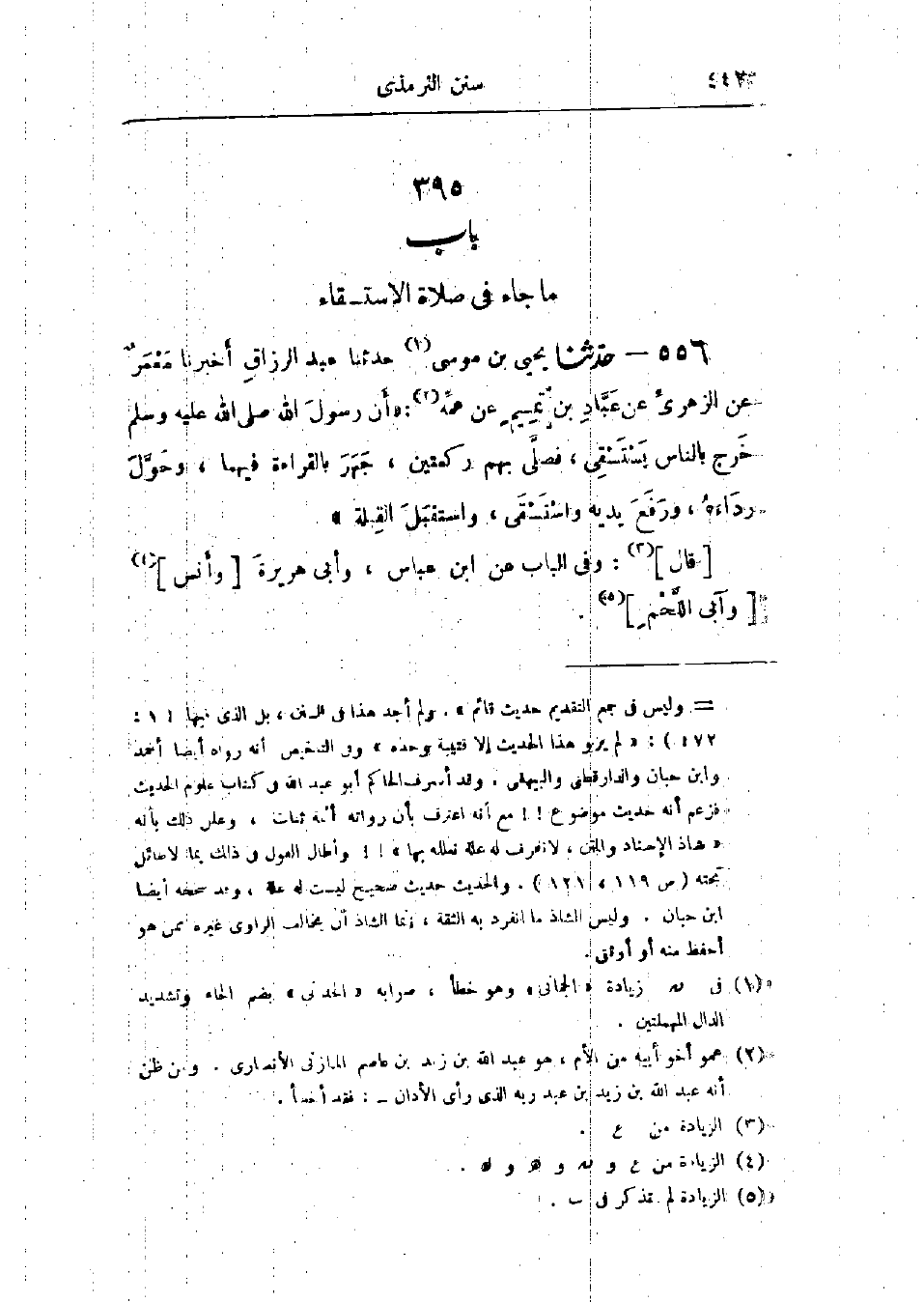556 - حَدَّثَنَا يَحْيَى بْنُ مُوسَى قَالَ: حَدَّثَنَا عَبْدُ الرَّزَّاقِ قَالَ: أَخْبَرَنَا مَعْمَرٌ، عَنْ الزُّهْرِيِّ، عَنْ عَبَّادِ بْنِ تَمِيمٍ، عَنْ عَمِّهِ، «أَنَّ رَسُولَ اللَّهِ صَلَّى اللَّهُ عَلَيْهِ وَسَلَّمَ §خَرَجَ بِالنَّاسِ يَسْتَسْقِي، فَصَلَّى بِهِمْ رَكْعَتَيْنِ جَهَرَ بِالقِرَاءَةِ فِيهِمَا، وَحَوَّلَ رِدَاءَهُ، وَرَفَعَ يَدَيْهِ وَاسْتَسْقَى، وَاسْتَقْبَلَ القِبْلَةَ» وَفِي البَابِ عَنْ ابْنِ عَبَّاسٍ، وَأَبِي هُرَيْرَةَ، وَأَنَسٍ، وَآبِي اللَّحْمِ: «-[443]- حَدِيثُ عَبْدِ اللَّهِ بْنِ زَيْدٍ حَدِيثٌ حَسَنٌ صَحِيحٌ، وَعَلَى هَذَا العَمَلُ عِنْدَ أَهْلِ العِلْمِ، وَبِهِ يَقُولُ الشَّافِعِيُّ، وَأَحْمَدُ، وَإِسْحَاقُ»، «وَعَمُّ عَبَّادِ بْنِ تَمِيمٍ هُوَ عَبْدُ اللَّهِ بْنُ زَيْدِ بْنِ عَاصِمٍ المَازِنِيُّ»