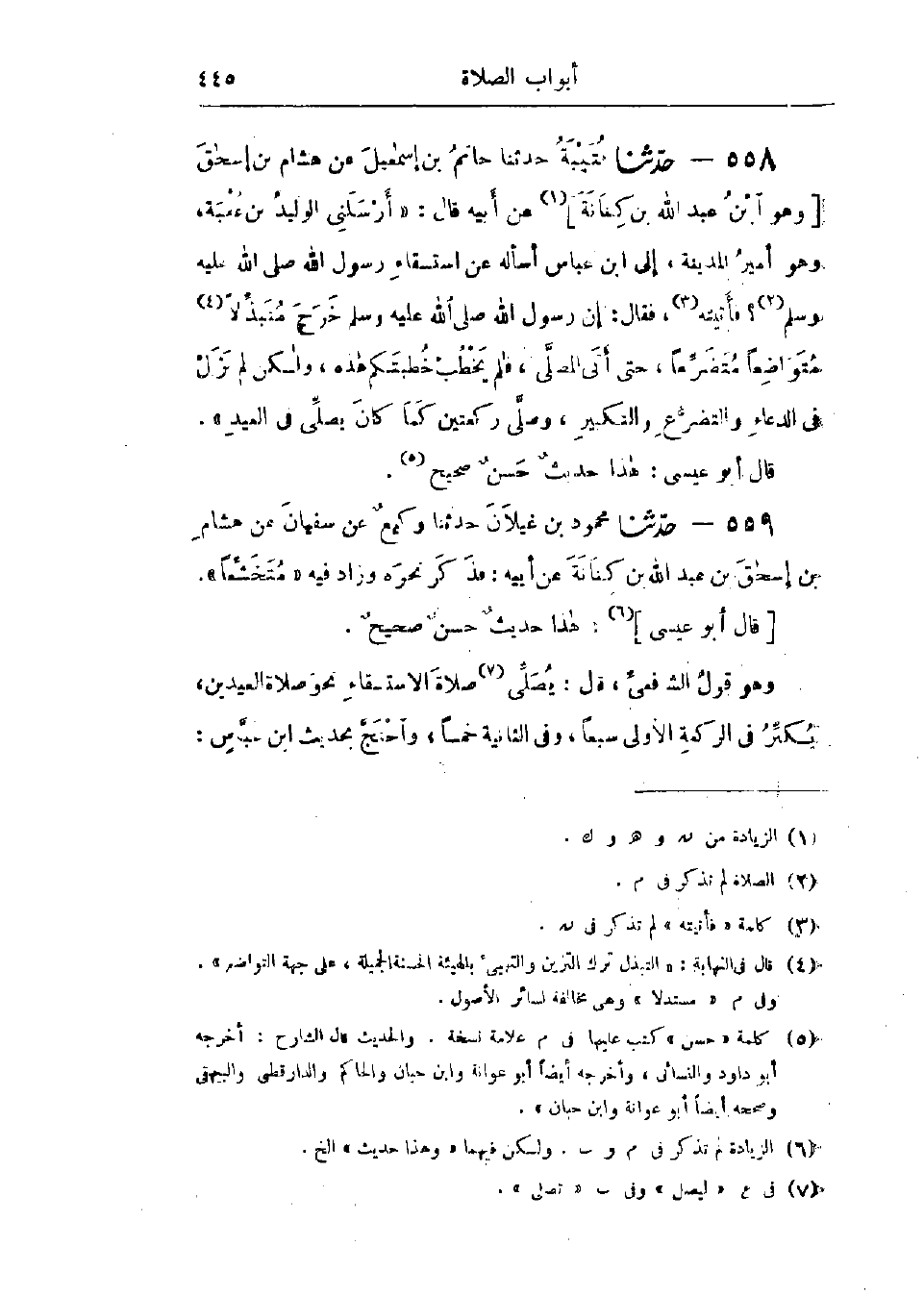 558 - حَدَّثَنَا قُتَيْبَةُ قَالَ: حَدَّثَنَا حَاتِمُ بْنُ إِسْمَاعِيلَ، عَنْ هِشَامِ بْنِ إِسْحَاقَ وَهُوَ ابْنُ عَبْدِ اللَّهِ بْنِ كِنَانَةَ، عَنْ أَبِيهِ، قَالَ: أَرْسَلَنِي الوَلِيدُ بْنُ عُقْبَةَ وَهُوَ أَمِيرُ المَدِينَةِ إِلَى ابْنِ عَبَّاسٍ أَسْأَلُهُ عَنْ اسْتِسْقَاءِ رَسُولِ اللَّهِ صَلَّى اللَّهُ عَلَيْهِ وَسَلَّمَ؟ فَأَتَيْتُهُ، فَقَالَ: «إِنَّ رَسُولَ اللَّهِ صَلَّى اللَّهُ عَلَيْهِ وَسَلَّمَ §خَرَجَ مُتَبَذِّلًا مُتَوَاضِعًا مُتَضَرِّعًا، حَتَّى أَتَى المُصَلَّى، فَلَمْ يَخْطُبْ خُطْبَتَكُمْ هَذِهِ، وَلَكِنْ لَمْ يَزَلْ فِي الدُّعَاءِ وَالتَّضَرُّعِ وَالتَّكْبِيرِ، وَصَلَّى رَكْعَتَيْنِ كَمَا كَانَ يُصَلِّي فِي العِيدِ»: «هَذَا حَدِيثٌ حَسَنٌ صَحِيحٌ»،