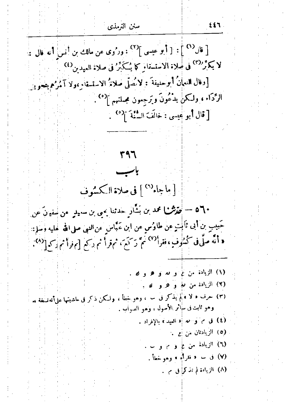 560 - حَدَّثَنَا مُحَمَّدُ بْنُ بَشَّارٍ قَالَ: حَدَّثَنَا يَحْيَى بْنُ سَعِيدٍ، عَنْ سُفْيَانَ، عَنْ حَبِيبِ بْنِ أَبِي ثَابِتٍ، عَنْ طَاوُسٍ، عَنْ ابْنِ عَبَّاسٍ، عَنْ النَّبِيِّ صَلَّى اللَّهُ عَلَيْهِ وَسَلَّمَ أَنَّهُ «§صَلَّى فِي كُسُوفٍ، فَقَرَأَ ثُمَّ رَكَعَ، ثُمَّ قَرَأَ ثُمَّ رَكَعَ ثُمَّ قَرَأَ، ثُمَّ رَكَعَ -[447]- ثَلَاثَ مَرَّاتٍ، ثُمَّ سَجَدَ سَجْدَتَيْنِ، وَالأُخْرَى مِثْلُهَا» وَفِي البَابِ عَنْ عَلِيٍّ، وَعَائِشَةَ، وَعَبْدِ اللَّهِ بْنِ عَمْرٍو، وَالنُّعْمَانِ بْنِ بَشِيرٍ، وَالمُغِيرَةِ بْنِ شُعْبَةَ، وَأَبِي مَسْعُودٍ، وَأَبِي بَكْرَةَ، وَسَمُرَةَ، وَأَبِي مُوسَى، وَابْنِ مَسْعُودٍ، وَأَسْمَاءَ بِنْتِ أَبِي بَكْرٍ، وَابْنِ عُمَرَ، وَقَبِيصَةَ الهِلَالِيِّ، وَجَابِرِ بْنِ عَبْدِ اللَّهِ، وَعَبْدِ الرَّحْمَنِ بْنِ سَمُرَةَ، وَأُبَيِّ بْنِ كَعْبٍ: «حَدِيثُ ابْنِ عَبَّاسٍ حَدِيثٌ حَسَنٌ صَحِيحٌ» وَقَدْ رُوِيَ عَنْ ابْنِ عَبَّاسٍ، عَنِ النَّبِيِّ صَلَّى اللَّهُ عَلَيْهِ وَسَلَّمَ، أَنَّهُ «صَلَّى فِي كُسُوفٍ أَرْبَعَ رَكَعَاتٍ فِي أَرْبَعِ سَجَدَاتٍ» -[448]- وَبِهِ يَقُولُ الشَّافِعِيُّ، وَأَحْمَدُ، وَإِسْحَاقُ. وَاخْتَلَفَ أَهْلُ العِلْمِ فِي القِرَاءَةِ فِي صَلَاةِ الكُسُوفِ، فَرَأَى بَعْضُ أَهْلِ العِلْمِ: أَنْ يُسِرَّ بِالقِرَاءَةِ فِيهَا بِالنَّهَارِ، وَرَأَى بَعْضُهُمْ: أَنْ يَجْهَرَ بِالقِرَاءَةِ فِيهَا، كَنَحْوِ صَلَاةِ العِيدَيْنِ وَالجُمُعَةِ، وَبِهِ يَقُولُ مَالِكٌ، وَأَحْمَدُ، وَإِسْحَاقُ: يَرَوْنَ الجَهْرَ فِيهَا قَالَ الشَّافِعِيُّ: لَا يَجْهَرُ فِيهَا وَقَدْ صَحَّ عَنِ النَّبِيِّ صَلَّى اللَّهُ عَلَيْهِ وَسَلَّمَ كِلْتَا الرِّوَايَتَيْنِ: صَحَّ عَنْهُ أَنَّهُ صَلَّى أَرْبَعَ رَكَعَاتٍ فِي أَرْبَعِ سَجَدَاتٍ، وَصَحَّ عَنْهُ أَنَّهُ صَلَّى سِتَّ رَكَعَاتٍ فِي أَرْبَعِ سَجَدَاتٍ وَهَذَا عِنْدَ أَهْلِ العِلْمِ جَائِزٌ عَلَى قَدْرِ الكُسُوفِ، إِنْ تَطَاوَلَ الكُسُوفُ فَصَلَّى سِتَّ رَكَعَاتٍ فِي أَرْبَعِ سَجَدَاتٍ، فَهُوَ جَائِزٌ، وَإِنْ صَلَّى أَرْبَعَ رَكَعَاتٍ -[449]- فِي أَرْبَعِ سَجَدَاتٍ وَأَطَالَ القِرَاءَةَ فَهُوَ جَائِزٌ، وَيَرَى أَصْحَابُنَا، أَنْ تُصَلَّى صَلَاةُ الكُسُوفِ فِي جَمَاعَةٍ فِي كُسُوفِ الشَّمْسِ وَالقَمَرِ