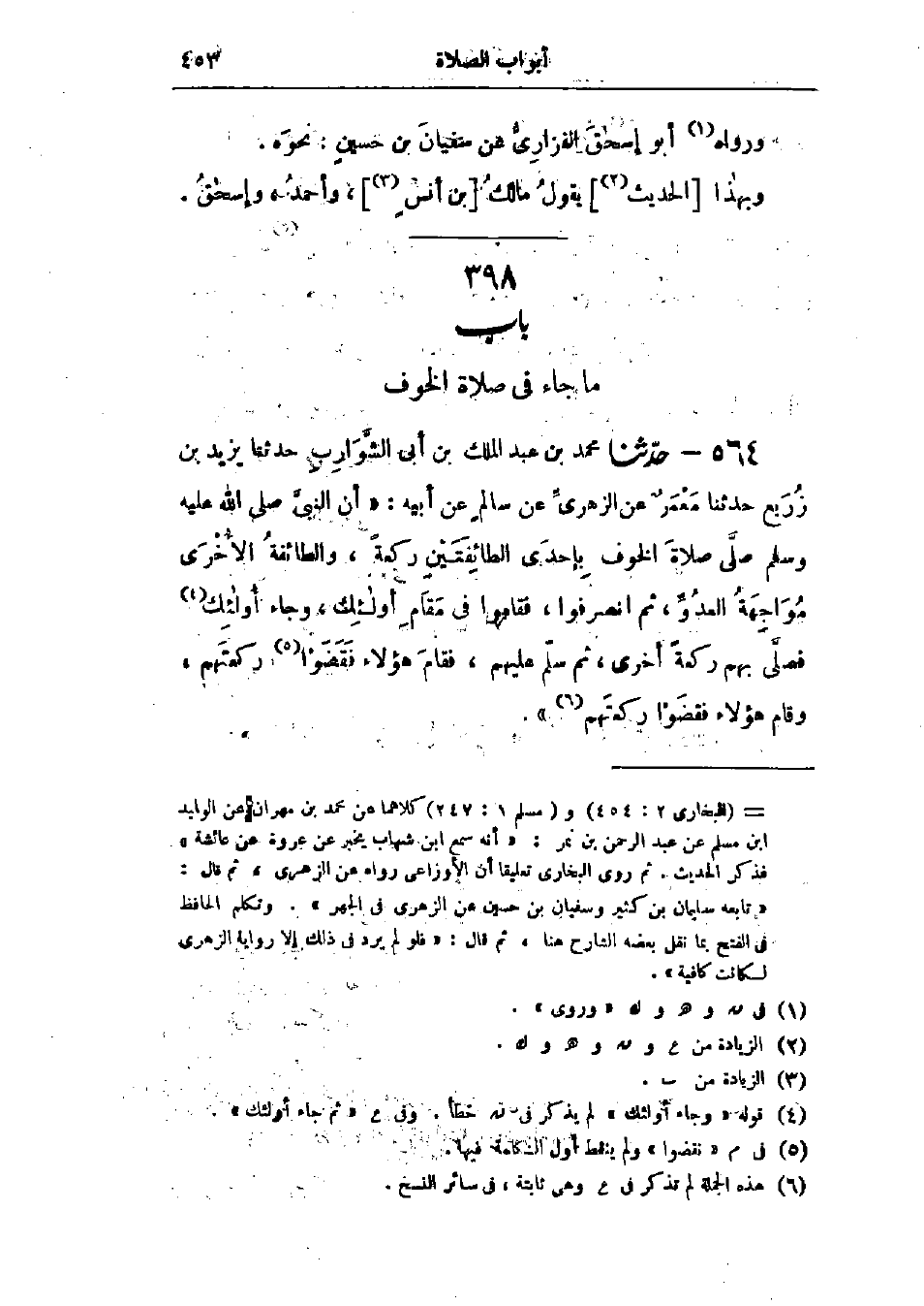 564 - حَدَّثَنَا مُحَمَّدُ بْنُ عَبْدِ المَلِكِ بْنِ أَبِي الشَّوَارِبِ قَالَ: حَدَّثَنَا يَزِيدُ بْنُ زُرَيْعٍ قَالَ: حَدَّثَنَا مَعْمَرٌ، عَنْ الزُّهْرِيِّ، عَنْ سَالِمٍ، عَنْ أَبِيهِ، «أَنَّ النَّبِيَّ صَلَّى اللَّهُ عَلَيْهِ وَسَلَّمَ §صَلَّى صَلَاةَ الخَوْفِ بِإِحْدَى الطَّائِفَتَيْنِ رَكْعَةً، وَالطَّائِفَةُ الأُخْرَى مُوَاجِهَةُ العَدُوِّ، ثُمَّ انْصَرَفُوا، فَقَامُوا فِي مَقَامِ أُولَئِكَ، وَجَاءَ أُولَئِكَ فَصَلَّى بِهِمْ رَكْعَةً أُخْرَى، ثُمَّ سَلَّمَ عَلَيْهِمْ، فَقَامَ هَؤُلَاءِ فَقَضَوْا رَكْعَتَهُمْ، وَقَامَ هَؤُلَاءِ فَقَضَوْا رَكْعَتَهُمْ»: -[454]- «هَذَا حَدِيثٌ حَسَنٌ صَحِيحٌ»، وَقَدْ رَوَى مُوسَى بْنُ عُقْبَةَ، عَنْ نَافِعٍ، عَنْ ابْنِ عُمَرَ، مِثْلَ هَذَا، وَفِي البَابِ عَنْ جَابِرٍ، وَحُذَيْفَةَ، وَزَيْدِ بْنِ ثَابِتٍ، وَابْنِ عَبَّاسٍ، وَأَبِي هُرَيْرَةَ، وَابْنِ مَسْعُودٍ، وَسَهْلِ بْنِ أَبِي حَثْمَةَ، وَأَبِي عَيَّاشٍ الزُّرَقِيِّ وَاسْمُهُ زَيْدُ بْنُ صَامِتٍ، وَأَبِي بَكْرَةَ،: «وَقَدْ ذَهَبَ مَالِكُ بْنُ أَنَسٍ فِي صَلَاةِ الخَوْفِ إِلَى حَدِيثِ سَهْلِ بْنِ أَبِي حَثْمَةَ، وَهُوَ قَوْلُ الشَّافِعِيِّ»، وقَالَ أَحْمَدُ: «قَدْ رُوِيَ عَنِ النَّبِيِّ صَلَّى اللَّهُ عَلَيْهِ وَسَلَّمَ صَلَاةُ الخَوْفِ عَلَى أَوْجُهٍ، وَمَا أَعْلَمُ فِي هَذَا البَابِ إِلَّا حَدِيثًا صَحِيحًا، وَأَخْتَارُ حَدِيثَ سَهْلِ بْنِ أَبِي حَثْمَةَ» وَهَكَذَا قَالَ إِسْحَاقُ بْنُ إِبْرَاهِيمَ قَالَ: «ثَبَتَتِ الرِّوَايَاتُ عَنِ النَّبِيِّ -[455]- صَلَّى اللَّهُ عَلَيْهِ وَسَلَّمَ فِي صَلَاةِ الخَوْفِ، وَرَأَى أَنَّ كُلَّ مَا رُوِيَ عَنِ النَّبِيِّ صَلَّى اللَّهُ عَلَيْهِ وَسَلَّمَ فِي صَلَاةِ الخَوْفِ فَهُوَ جَائِزٌ، وَهَذَا عَلَى قَدْرِ الخَوْفِ» قَالَ إِسْحَاقُ: «وَلَسْنَا نَخْتَارُ حَدِيثَ سَهْلِ بْنِ أَبِي حَثْمَةَ عَلَى غَيْرِهِ مِنَ الرِّوَايَاتِ»