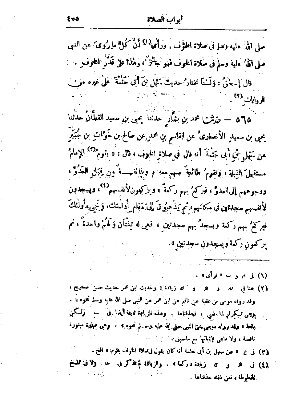 565 - حَدَّثَنَا مُحَمَّدُ بْنُ بَشَّارٍ قَالَ: حَدَّثَنَا يَحْيَى بْنُ سَعِيدٍ القَطَّانُ قَالَ: حَدَّثَنَا يَحْيَى بْنُ سَعِيدٍ الأَنْصَارِيُّ، عَنْ القَاسِمِ بْنِ مُحَمَّدٍ، عَنْ صَالِحِ بْنِ خَوَّاتِ بْنِ جُبَيْرٍ، عَنْ سَهْلِ بْنِ أَبِي حَثْمَةَ، أَنَّهُ قَالَ فِي §صَلَاةِ الخَوْفِ، قَالَ: «يَقُومُ الإِمَامُ مُسْتَقْبِلَ القِبْلَةِ، وَتَقُومُ طَائِفَةٌ مِنْهُمْ مَعَهُ، وَطَائِفَةٌ مِنْ قِبَلِ العَدُوِّ، وَوُجُوهُهُمْ إِلَى العَدُوِّ، فَيَرْكَعُ بِهِمْ رَكْعَةً، وَيَرْكَعُونَ لِأَنْفُسِهِمْ، وَيَسْجُدُونَ لِأَنْفُسِهِمْ سَجْدَتَيْنِ فِي مَكَانِهِمْ، ثُمَّ يَذْهَبُونَ إِلَى مَقَامِ أُولَئِكَ، وَيَجِيءُ أُولَئِكَ، فَيَرْكَعُ بِهِمْ رَكْعَةً وَيَسْجُدُ بِهِمْ سَجْدَتَيْنِ، فَهِيَ لَهُ ثِنْتَانِ وَلَهُمْ وَاحِدَةٌ، ثُمَّ يَرْكَعُونَ رَكْعَةً وَيَسْجُدُونَ سَجْدَتَيْنِ»: