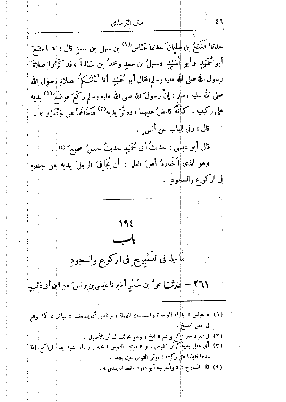 261 - حَدَّثَنَا عَلِيُّ بْنُ حُجْرٍ قَالَ: أَخْبَرَنَا عِيسَى بْنُ يُونُسَ، عَنْ ابْنِ أَبِي ذِئْبٍ، -[47]- عَنْ إِسْحَاقَ بْنِ يَزِيدَ الهُذَلِيِّ، عَنْ عَوْنِ بْنِ عَبْدِ اللَّهِ بْنِ عُتْبَةَ، عَنْ ابْنِ مَسْعُودٍ، أَنَّ النَّبِيَّ صَلَّى اللَّهُ عَلَيْهِ وَسَلَّمَ قَالَ: " §إِذَا رَكَعَ أَحَدُكُمْ، فَقَالَ فِي رُكُوعِهِ: سُبْحَانَ رَبِّيَ العَظِيمِ ثَلَاثَ مَرَّاتٍ، فَقَدْ تَمَّ رُكُوعُهُ، وَذَلِكَ أَدْنَاهُ، وَإِذَا سَجَدَ، فَقَالَ فِي سُجُودِهِ: سُبْحَانَ رَبِّيَ الأَعْلَى ثَلَاثَ مَرَّاتٍ، فَقَدْ تَمَّ سُجُودُهُ، وَذَلِكَ أَدْنَاهُ ". وَفِي البَابِ عَنْ حُذَيْفَةَ، وَعُقْبَةَ بْنِ عَامِرٍ. حَدِيثُ ابْنِ مَسْعُودٍ لَيْسَ إِسْنَادُهُ بِمُتَّصِلٍ، عَوْنُ بْنُ عَبْدِ اللَّهِ بْنِ عُتْبَةَ لَمْ يَلْقَ ابْنَ مَسْعُودٍ، وَالعَمَلُ عَلَى هَذَا عِنْدَ أَهْلِ العِلْمِ: يَسْتَحِبُّونَ أَنْ لَا يَنْقُصَ الرَّجُلُ فِي الرُّكُوعِ وَالسُّجُودِ مِنْ ثَلَاثِ تَسْبِيحَاتٍ. وَرُوِيَ عَنِ ابْنِ المُبَارَكِ أَنَّهُ قَالَ: «أَسْتَحِبُّ لِلإِمَامِ أَنْ يُسَبِّحَ -[48]- خَمْسَ تَسْبِيحَاتٍ لِكَيْ يُدْرِكَ مَنْ خَلْفَهُ ثَلَاثَ تَسْبِيحَاتٍ» وَهَكَذَا قَالَ إِسْحَاقُ بْنُ إِبْرَاهِيمَ