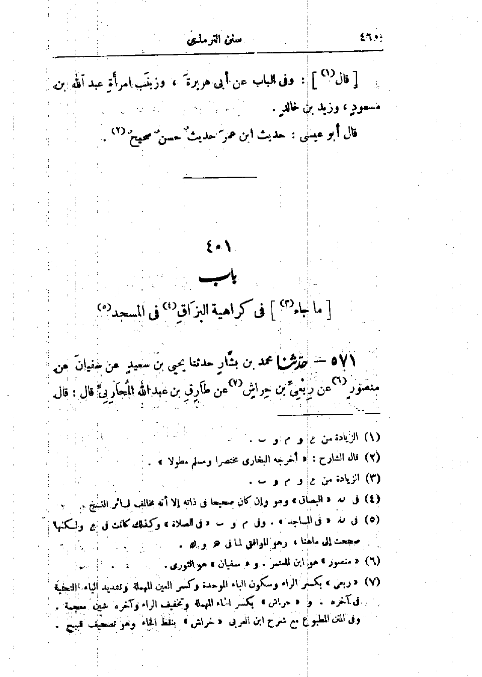 571 - حَدَّثَنَا مُحَمَّدُ بْنُ بَشَّارٍ قَالَ: حَدَّثَنَا يَحْيَى بْنُ سَعِيدٍ، عَنْ سُفْيَانَ، عَنْ مَنْصُورٍ، عَنْ رِبْعِيِّ بْنِ حِرَاشٍ، عَنْ طَارِقِ بْنِ عَبْدِ اللَّهِ المُحَارِبِيِّ، قَالَ: قَالَ -[461]- رَسُولُ اللَّهِ صَلَّى اللَّهُ عَلَيْهِ وَسَلَّمَ: «§إِذَا كُنْتَ فِي الصَّلَاةِ فَلَا تَبْزُقْ عَنْ يَمِينِكَ، وَلَكِنْ خَلْفَكَ، أَوْ تِلْقَاءَ شِمَالِكَ، أَوْ تَحْتَ قَدَمِكَ اليُسْرَى» وَفِي البَابِ عَنْ أَبِي سَعِيدٍ، وَابْنِ عُمَرَ، وَأَنَسٍ، وَأَبِي هُرَيْرَةَ. حَدِيثُ طَارِقٍ حَدِيثٌ حَسَنٌ صَحِيحٌ، وَالعَمَلُ عَلَى هَذَا عِنْدَ أَهْلِ العِلْمِ، وَسَمِعْتُ الجَارُودَ يَقُولُ: سَمِعْتُ وَكِيعًا يَقُولُ: «لَمْ يَكْذِبْ رِبْعِيُّ بْنُ حِرَاشٍ فِي الإِسْلَامِ كَذْبَةً»، وقَالَ عَبْدُ الرَّحْمَنِ بْنُ مَهْدِيٍّ: «أَثْبَتُ أَهْلِ الكُوفَةِ مَنْصُورُ بْنُ المُعْتَمِرِ»