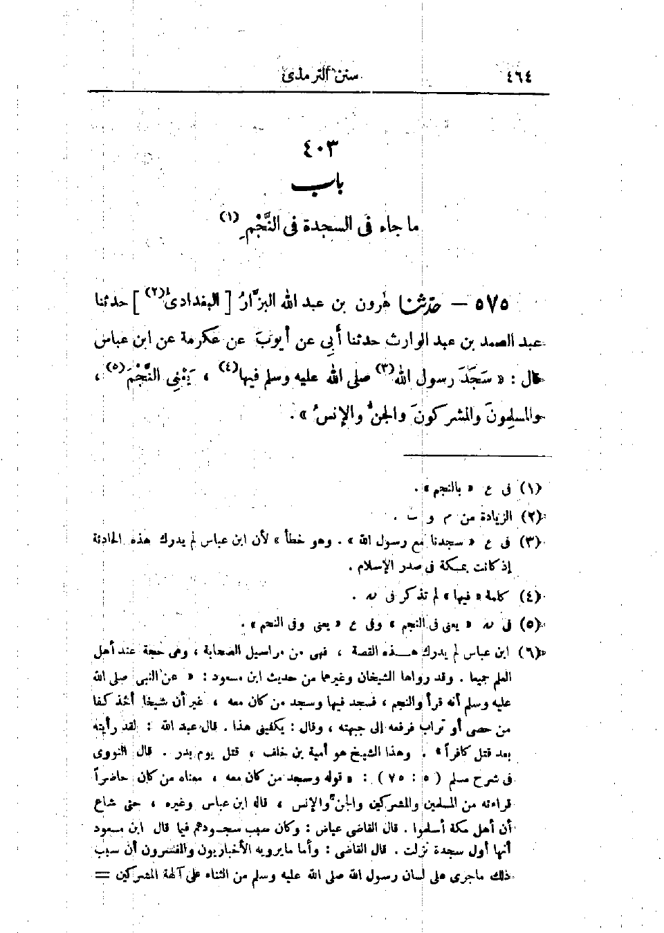 575 - حَدَّثَنَا هَارُونُ بْنُ عَبْدِ اللَّهِ البَزَّازُ قَالَ: حَدَّثَنَا عَبْدُ الصَّمَدِ بْنُ عَبْدِ الوَارِثِ قَالَ: حَدَّثَنَا أَبِي، عَنْ أَيُّوبَ، عَنْ عِكْرِمَةَ، عَنْ ابْنِ عَبَّاسٍ، قَالَ: «§سَجَدَ رَسُولُ اللَّهِ صَلَّى اللَّهُ عَلَيْهِ وَسَلَّمَ فِيهَا - يَعْنِي النَّجْمَ - وَالمُسْلِمُونَ وَالمُشْرِكُونَ وَالجِنُّ وَالإِنْسُ» -[465]- وَفِي البَابِ عَنْ ابْنِ مَسْعُودٍ، وَأَبِي هُرَيْرَةَ: «حَدِيثُ ابْنِ عَبَّاسٍ حَدِيثٌ حَسَنٌ صَحِيحٌ»، " وَالعَمَلُ عَلَى هَذَا عِنْدَ بَعْضِ أَهْلِ العِلْمِ: يَرَوْنَ السُّجُودَ فِي سُورَةِ النَّجْمِ «،» وقَالَ بَعْضُ أَهْلِ العِلْمِ مِنْ أَصْحَابِ النَّبِيِّ صَلَّى اللَّهُ عَلَيْهِ وَسَلَّمَ وَغَيْرِهِمْ: لَيْسَ فِي المُفَصَّلِ سَجْدَةٌ، وَهُوَ قَوْلُ مَالِكِ بْنِ أَنَسٍ، وَالقَوْلُ الأَوَّلُ أَصَحُّ، وَبِهِ يَقُولُ الثَّوْرِيُّ، وَابْنُ المُبَارَكِ، وَالشَّافِعِيُّ، وَأَحْمَدُ، وَإِسْحَاقُ "