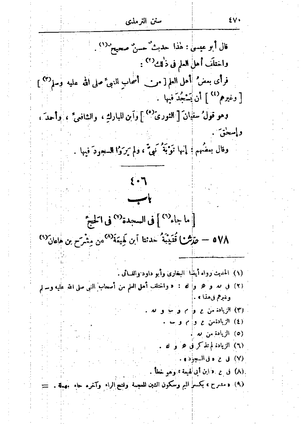 578 - حَدَّثَنَا قُتَيْبَةُ قَالَ: حَدَّثَنَا ابْنُ لَهِيعَةَ، عَنْ مِشْرَحِ بْنِ هَاعَانَ، -[471]- عَنْ عُقْبَةَ بْنِ عَامِرٍ، قَالَ: قُلْتُ: يَا رَسُولَ اللَّهِ، فُضِّلَتْ سُورَةُ الحَجِّ بِأَنَّ فِيهَا سَجْدَتَيْنِ؟ قَالَ: «نَعَمْ، §وَمَنْ لَمْ يَسْجُدْهُمَا فَلَا يَقْرَأْهُمَا»: «هَذَا حَدِيثٌ لَيْسَ إِسْنَادُهُ بِذَاكَ القَوِيِّ، -[472]- وَاخْتَلَفَ أَهْلُ العِلْمِ فِي هَذَا»، فَرُوِيَ عَنْ عُمَرَ بْنِ الخَطَّابِ، وَابْنِ عُمَرَ، أَنَّهُمَا قَالَا: «فُضِّلَتْ سُورَةُ الحَجِّ بِأَنَّ فِيهَا سَجْدَتَيْنِ»، «وَبِهِ يَقُولُ ابْنُ المُبَارَكِ، وَالشَّافِعِيُّ، وَأَحْمَدُ، وَإِسْحَاقُ»، «وَرَأَى بَعْضُهُمْ فِيهَا سَجْدَةً وَهُوَ قَوْلُ سُفْيَانَ الثَّوْرِيِّ، وَمَالِكٍ، وَأَهْلِ الكُوفَةِ»