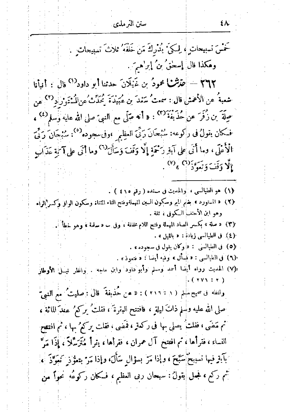262 - حَدَّثَنَا مَحْمُودُ بْنُ غَيْلَانَ قَالَ: حَدَّثَنَا أَبُو دَاوُدَ، قَالَ: أَنْبَأَنَا شُعْبَةُ، عَنْ الأَعْمَشِ، قَال: سَمِعْتُ سَعْدَ بْنَ عُبَيْدَةَ يُحَدِّثُ، عَنْ المُسْتَوْرِدِ، عَنْ صِلَةَ بْنِ زُفَرَ، عَنْ حُذَيْفَةَ، أَنَّهُ صَلَّى مَعَ النَّبِيِّ صَلَّى اللَّهُ عَلَيْهِ وَسَلَّمَ، فَكَانَ §يَقُولُ فِي رُكُوعِهِ: «سُبْحَانَ رَبِّيَ العَظِيمِ، وَفِي سُجُودِهِ، سُبْحَانَ رَبِّيَ الأَعْلَى»، وَمَا أَتَى عَلَى آيَةِ رَحْمَةٍ إِلَّا وَقَفَ وَسَأَلَ، وَمَا أَتَى عَلَى آيَةِ عَذَابٍ إِلَّا وَقَفَ وَتَعَوَّذَ. -[49]- وَهَذَا حَدِيثٌ حَسَنٌ صَحِيحٌ.