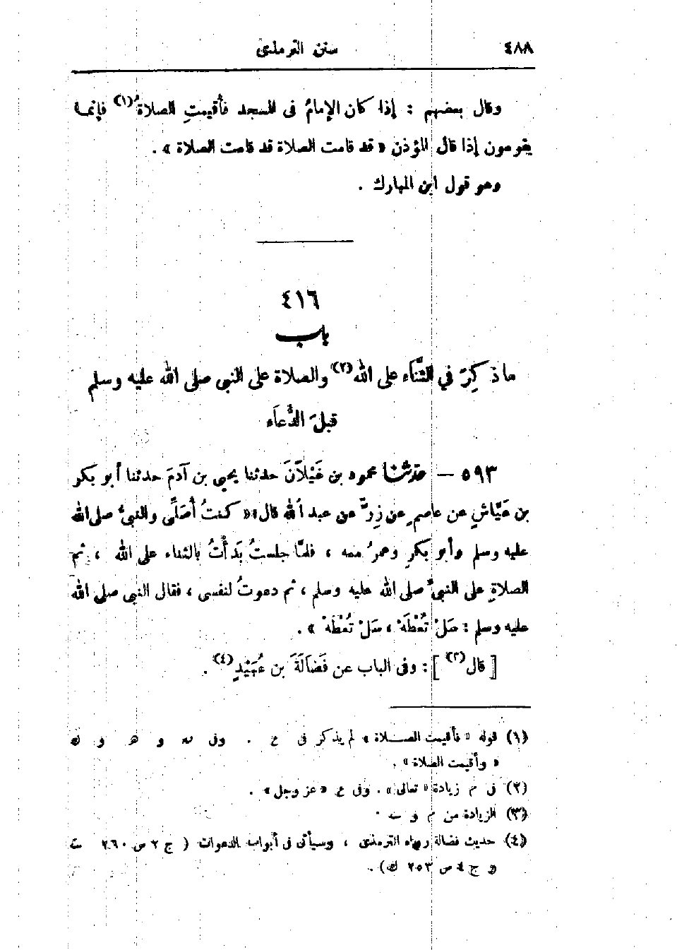 593 - حَدَّثَنَا مَحْمُودُ بْنُ غَيْلَانَ قَالَ: حَدَّثَنَا يَحْيَى بْنُ آدَمَ قَالَ: حَدَّثَنَا أَبُو بَكْرِ بْنُ عَيَّاشٍ، عَنْ عَاصِمٍ، عَنْ زِرٍّ، عَنْ عَبْدِ اللَّهِ، قَالَ: كُنْتُ أُصَلِّي وَالنَّبِيُّ صَلَّى اللَّهُ عَلَيْهِ وَسَلَّمَ، وَأَبُو بَكْرٍ، وَعُمَرُ مَعَهُ، فَلَمَّا جَلَسْتُ §بَدَأْتُ بِالثَّنَاءِ عَلَى اللَّهِ، ثُمَّ الصَّلَاةِ عَلَى النَّبِيِّ صَلَّى اللَّهُ عَلَيْهِ وَسَلَّمَ، ثُمَّ دَعَوْتُ لِنَفْسِي، فَقَالَ النَّبِيُّ صَلَّى اللَّهُ عَلَيْهِ وَسَلَّمَ: «سَلْ تُعْطَهْ، سَلْ تُعْطَهْ» وَفِي البَابِ عَنْ فَضَالَةَ بْنِ عُبَيْدٍ: -[489]- «حَدِيثُ عَبْدِ اللَّهِ بْنِ مَسْعُودٍ حَدِيثٌ حَسَنٌ صَحِيحٌ»: هَذَا الحَدِيثُ رَوَاهُ أَحْمَدُ بْنُ حَنْبَلٍ، عَنْ يَحْيَى بْنِ آدَمَ مُخْتَصَرًا