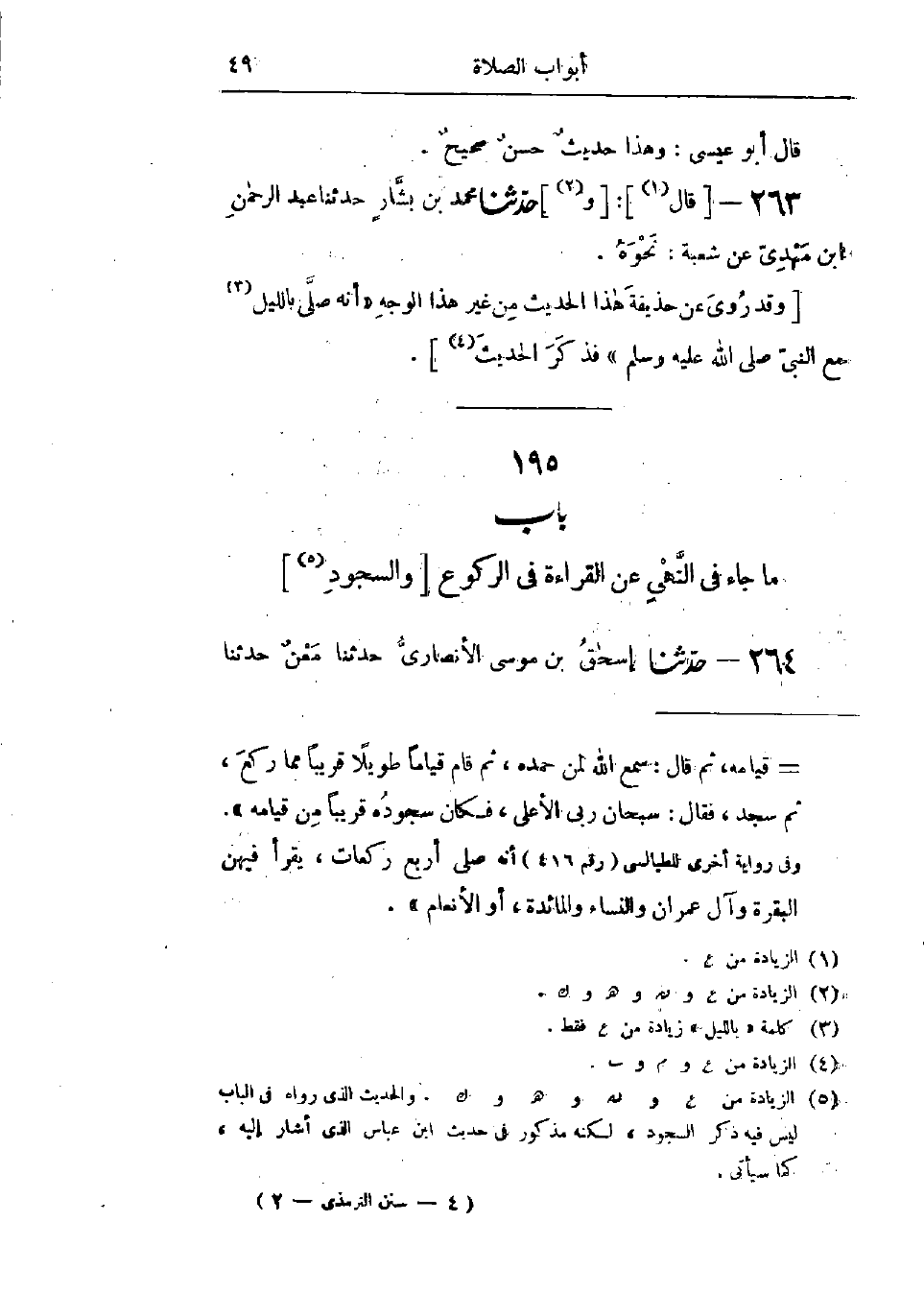 264 - حَدَّثَنَا إِسْحَاقُ بْنُ مُوسَى الأَنْصَارِيُّ قَالَ: حَدَّثَنَا مَعْنٌ قَالَ: حَدَّثَنَا -[50]- مَالِكٌ، ح وحَدَّثَنَا قُتَيْبَةُ، عَنْ مَالِكٍ، عَنْ نَافِعٍ، عَنْ إِبْرَاهِيمَ بْنِ عَبْدِ اللَّهِ بْنِ حُنَيْنٍ، عَنْ أَبِيهِ، عَنْ عَلِيِّ بْنِ أَبِي طَالِبٍ، «أَنَّ النَّبِيَّ صَلَّى اللَّهُ عَلَيْهِ وَسَلَّمَ §نَهَى عَنْ لُبْسِ القَسِّيِّ، وَالمُعَصْفَرِ، وَعَنْ تَخَتُّمِ الذَّهَبِ، وَعَنْ قِرَاءَةِ القُرْآنِ فِي الرُّكُوعِ». وَفِي البَابِ عَنْ ابْنِ عَبَّاسٍ. -[51]- حَدِيثُ عَلِيٍّ حَدِيثٌ حَسَنٌ صَحِيحٌ، وَهُوَ قَوْلُ أَهْلِ العِلْمِ مِنْ أَصْحَابِ النَّبِيِّ صَلَّى اللَّهُ عَلَيْهِ وَسَلَّمَ، وَمَنْ بَعْدَهُمْ: كَرِهُوا القِرَاءَةَ فِي الرُّكُوعِ وَالسُّجُودِ