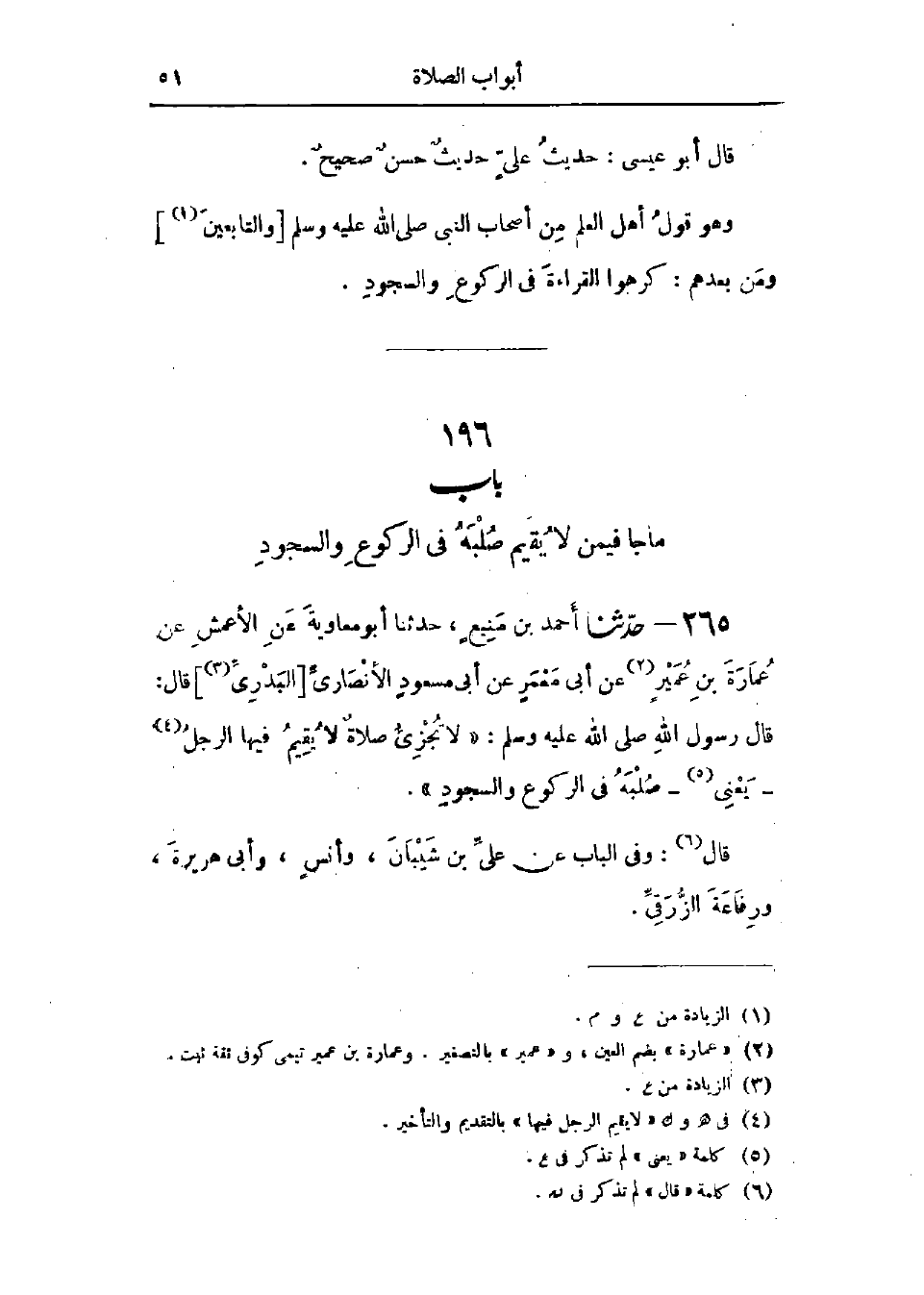 265 - حَدَّثَنَا أَحْمَدُ بْنُ مَنِيعٍ قَالَ: حَدَّثَنَا أَبُو مُعَاوِيَةَ، عَنْ الأَعْمَشِ، عَنْ عُمَارَةَ بْنِ عُمَيْرٍ، عَنْ أَبِي مَعْمَرٍ، عَنْ أَبِي مَسْعُودٍ الأَنْصَارِيِّ، قَالَ: قَالَ رَسُولُ اللَّهِ صَلَّى اللَّهُ عَلَيْهِ وَسَلَّمَ: «§لَا تُجْزِئُ صَلَاةٌ لَا يُقِيمُ فِيهَا الرَّجُلُ - يَعْنِي - صُلْبَهُ فِي الرُّكُوعِ وَالسُّجُودِ». وَفِي البَابِ عَنْ عَلِيِّ بْنِ شَيْبَانَ، وَأَنَسٍ، وَأَبِي هُرَيْرَةَ، وَرِفَاعَةَ الزُّرَقِيِّ. -[52]- حَدِيثُ أَبِي مَسْعُودٍ حَدِيثٌ حَسَنٌ صَحِيحٌ، وَالعَمَلُ عَلَى هَذَا عِنْدَ أَهْلِ العِلْمِ مِنْ أَصْحَابِ النَّبِيِّ صَلَّى اللَّهُ عَلَيْهِ وَسَلَّمَ، وَمَنْ بَعْدَهُمْ: يَرَوْنَ أَنْ يُقِيمَ الرَّجُلُ صُلْبَهُ فِي الرُّكُوعِ وَالسُّجُودِ. قَالَ الشَّافِعِيُّ، وَأَحْمَدُ، وَإِسْحَاقُ: «مَنْ لَا يُقِيمُ صُلْبَهُ فِي الرُّكُوعِ وَالسُّجُودِ فَصَلَاتُهُ فَاسِدَةٌ» لِحَدِيثِ النَّبِيِّ صَلَّى اللَّهُ عَلَيْهِ وَسَلَّمَ: «لَا تُجْزِئُ صَلَاةٌ لَا يُقِيمُ الرَّجُلُ فِيهَا صُلْبَهُ فِي الرُّكُوعِ وَالسُّجُودِ» وَأَبُو مَعْمَرٍ اسْمُهُ عَبْدُ اللَّهِ بْنُ سَخْبَرَةَ، وَأَبُو مَسْعُودٍ الأَنْصَارِيُّ البَدْرِيُّ اسْمُهُ عُقْبَةُ بْنُ عَمْرٍو