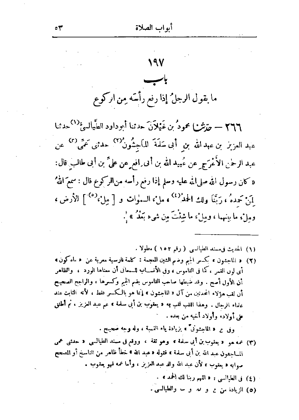 266 - حَدَّثَنَا مَحْمُودُ بْنُ غَيْلَانَ قَالَ: حَدَّثَنَا أَبُو دَاوُدَ الطَّيَالِسِيُّ قَالَ: حَدَّثَنَا عَبْدُ العَزِيزِ بْنُ عَبْدِ اللَّهِ بْنِ أَبِي سَلَمَةَ المَاجِشُونُ قَالَ: حَدَّثَنِي عَمِّي، عَنْ عَبْدِ الرَّحْمَنِ الأَعْرَجِ، عَنْ عُبَيْدِ اللَّهِ بْنِ أَبِي رَافِعٍ، عَنْ عَلِيِّ بْنِ أَبِي طَالِبٍ، قَالَ: كَانَ رَسُولُ اللَّهِ صَلَّى اللَّهُ عَلَيْهِ وَسَلَّمَ §إِذَا رَفَعَ رَأْسَهُ مِنَ الرُّكُوعِ قَالَ: «سَمِعَ اللَّهُ لِمَنْ حَمِدَهُ، رَبَّنَا وَلَكَ الحَمْدُ مِلْءَ السَّمَوَاتِ وَالْأَرْضِ، وَمِلْءَ مَا بَيْنَهُمَا، وَمِلْءَ مَا شِئْتَ مِنْ شَيْءٍ بَعْدُ». -[54]- وَفِي البَابِ عَنْ ابْنِ عُمَرَ، وَابْنِ عَبَّاسٍ، وَابْنِ أَبِي أَوْفَى، وَأَبِي جُحَيْفَةَ، وَأَبِي سَعِيدٍ. حَدِيثُ عَلِيٍّ حَدِيثٌ حَسَنٌ صَحِيحٌ، وَالعَمَلُ عَلَى هَذَا عِنْدَ بَعْضِ أَهْلِ العِلْمِ وَبِهِ يَقُولُ: الشَّافِعِيُّ قَالَ: «يَقُولُ هَذَا فِي المَكْتُوبَةِ وَالتَّطَوُّعِ» وقَالَ بَعْضُ أَهْلِ الكُوفَةِ: يَقُولُ هَذَا فِي صَلَاةِ التَّطَوُّعِ، وَلَا يَقُولُهُ فِي صَلَاةِ المَكْتُوبَةِ