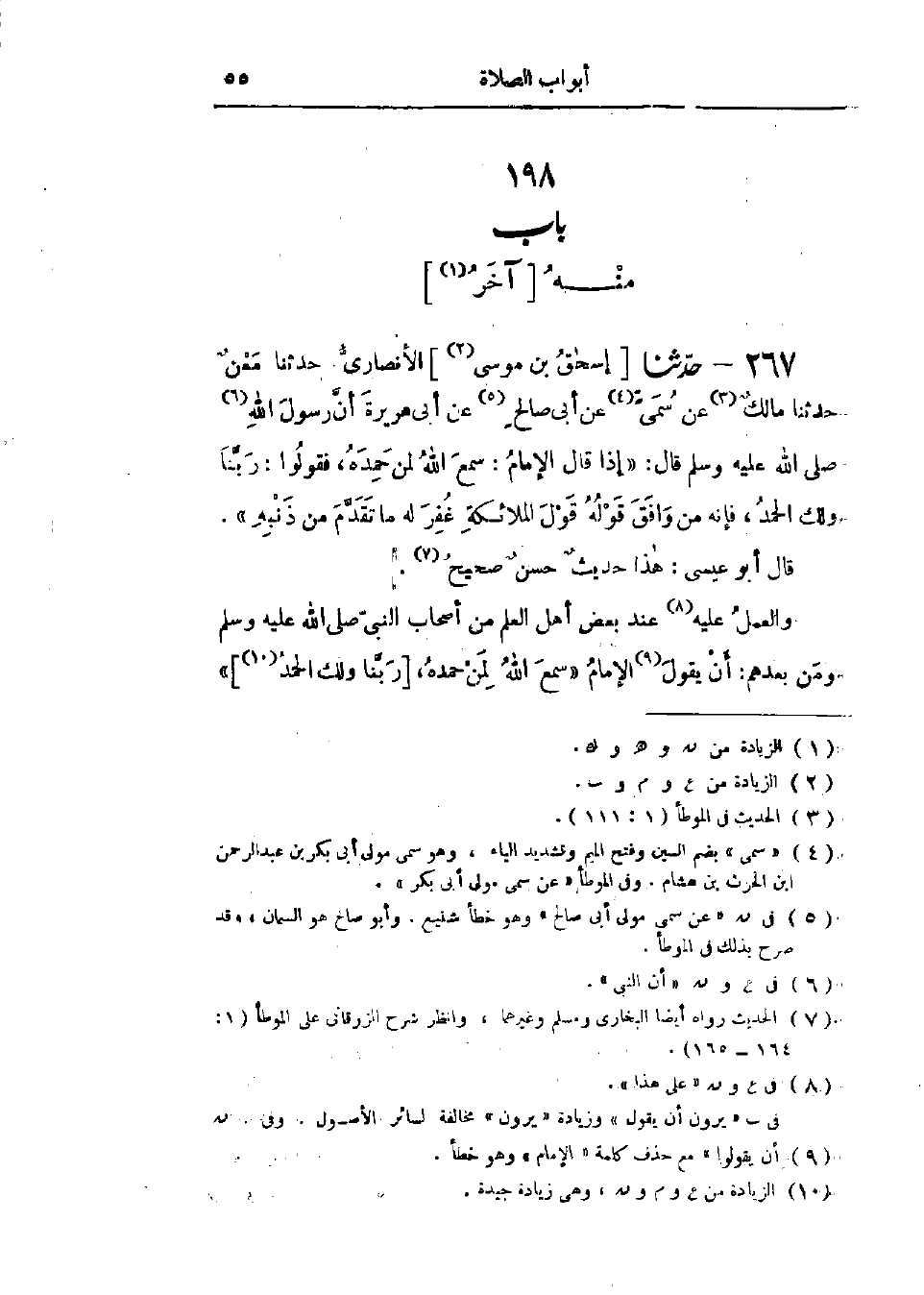 267 - حَدَّثَنَا الْأَنْصَارِيُّ قَالَ: حَدَّثَنَا مَعْنٌ قَالَ: حَدَّثَنَا مَالِكٌ، عَنْ سُمَيٍّ، عَنْ أَبِي صَالِحٍ، عَنْ أَبِي هُرَيْرَةَ، أَنَّ رَسُولَ اللَّهِ صَلَّى اللَّهُ عَلَيْهِ وَسَلَّمَ قَالَ: " §إِذَا قَالَ الإِمَامُ: سَمِعَ اللَّهُ لِمَنْ حَمِدَهُ، فَقُولُوا: رَبَّنَا وَلَكَ الحَمْدُ، فَإِنَّهُ مَنْ وَافَقَ قَوْلُهُ قَوْلَ المَلَائِكَةِ غُفِرَ لَهُ مَا تَقَدَّمَ مِنْ ذَنْبِهِ "،: «هَذَا حَدِيثٌ حَسَنٌ صَحِيحٌ» وَالعَمَلُ عَلَيْهِ عِنْدَ بَعْضِ أَهْلِ العِلْمِ مِنْ أَصْحَابِ النَّبِيِّ صَلَّى اللَّهُ عَلَيْهِ وَسَلَّمَ، وَمَنْ بَعْدَهُمْ أَنْ يَقُولَ الإِمَامُ: سَمِعَ اللَّهُ لِمَنْ حَمِدَهُ، -[56]- وَيَقُولَ مَنْ خَلْفَ الإِمَامِ: رَبَّنَا وَلَكَ الحَمْدُ، وَبِهِ يَقُولُ أَحْمَدُ " وقَالَ ابْنُ سِيرِينَ وَغَيْرُهُ: «يَقُولُ مَنْ خَلْفَ الإِمَامِ سَمِعَ اللَّهُ لِمَنْ حَمِدَهُ، رَبَّنَا وَلَكَ الحَمْدُ، مِثْلَ مَا يَقُولُ الإِمَامُ، وَبِهِ يَقُولُ الشَّافِعِيُّ، وَإِسْحَاقُ»