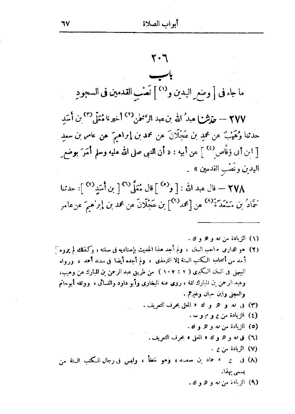 277 - حَدَّثَنَا عَبْدُ اللَّهِ بْنُ عَبْدِ الرَّحْمَنِ قَالَ: أَخْبَرَنَا مُعَلَّى بْنُ أَسَدٍ قَالَ: حَدَّثَنَا وُهَيْبٌ، عَنْ مُحَمَّدِ بْنِ عَجْلَانَ، عَنْ مُحَمَّدِ بْنِ إِبْرَاهِيمَ، عَنْ عَامِرِ بْنِ سَعْدٍ، عَنْ أَبِيهِ، «أَنَّ النَّبِيَّ صَلَّى اللَّهُ عَلَيْهِ وَسَلَّمَ §أَمَرَ بِوَضْعِ اليَدَيْنِ وَنَصْبِ القَدَمَيْنِ»،