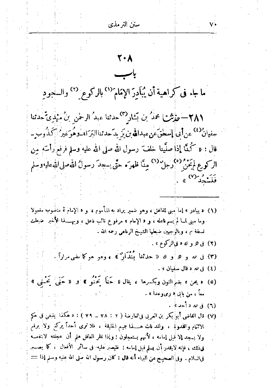 281 - حَدَّثَنَا بُنْدَارٌ قَالَ: حَدَّثَنَا عَبْدُ الرَّحْمَنِ بْنُ مَهْدِيٍّ قَالَ: حَدَّثَنَا سُفْيَانُ، عَنْ أَبِي إِسْحَاقَ، عَنْ عَبْدِ اللَّهِ بْنِ يَزِيدَ قَالَ: حَدَّثَنَا البَرَاءُ، وَهُوَ غَيْرُ كَذُوبٍ، قَالَ: «كُنَّا §إِذَا صَلَّيْنَا خَلْفَ رَسُولِ اللَّهِ صَلَّى اللَّهُ عَلَيْهِ وَسَلَّمَ فَرَفَعَ رَأْسَهُ مِنَ الرُّكُوعِ، لَمْ يَحْنِ رَجُلٌ مِنَّا ظَهْرَهُ حَتَّى يَسْجُدَ رَسُولُ اللَّهِ صَلَّى اللَّهُ عَلَيْهِ وَسَلَّمَ فَنَسْجُدَ»، -[71]- وَفِي البَابِ عَنْ أَنَسٍ، وَمُعَاوِيَةَ، وَابْنِ مَسْعَدَةَ صَاحِبِ الجُيُوشِ، وَأَبِي هُرَيْرَةَ،: «حَدِيثُ البَرَاءِ حَدِيثٌ حَسَنٌ صَحِيحٌ» -[72]- وَبِهِ يَقُولُ أَهْلُ العِلْمِ: إِنَّ مَنْ خَلْفَ الإِمَامِ إِنَّمَا يَتْبَعُونَ الإِمَامَ فِيمَا يَصْنَعُ لَا يَرْكَعُونَ إِلَّا بَعْدَ رُكُوعِهِ، وَلَا يَرْفَعُونَ إِلَّا بَعْدَ رَفْعِهِ، لَا نَعْلَمُ بَيْنَهُمْ فِي ذَلِكَ اخْتِلَافًا "
