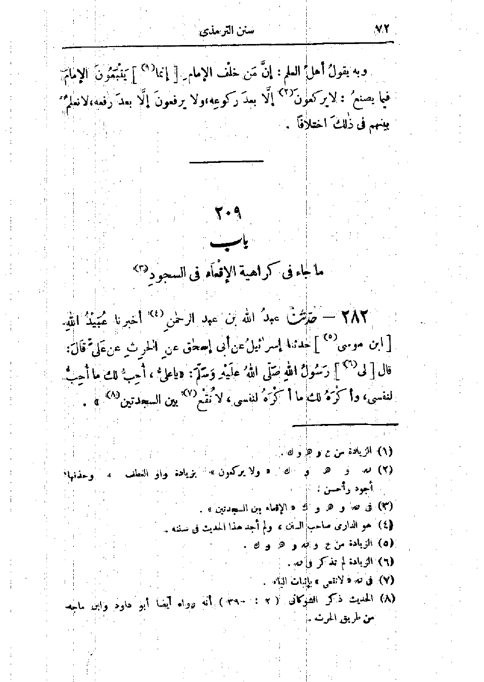 282 - حَدَّثَنَا عَبْدُ اللَّهِ بْنُ عَبْدِ الرَّحْمَنِ قَالَ: أَخْبَرَنَا عُبَيْدُ اللَّهِ بْنُ مُوسَى قَالَ: أَخْبَرَنَا إِسْرَائِيلُ، عَنْ أَبِي إِسْحَاقَ، عَنْ الحَارِثِ، عَنْ عَلِيٍّ، قَالَ: قَالَ لِي رَسُولُ اللَّهِ صَلَّى اللَّهُ عَلَيْهِ وَسَلَّمَ: «يَا عَلِيُّ، أُحِبُّ لَكَ مَا أُحِبُّ لِنَفْسِي، وَأَكْرَهُ لَكَ مَا أَكْرَهُ لِنَفْسِي، §لَا تُقْعِ بَيْنَ السَّجْدَتَيْنِ»، -[73]- «هَذَا حَدِيثٌ لَا نَعْرِفُهُ مِنْ حَدِيثِ عَلِيٍّ، إِلَّا مِنْ حَدِيثِ أَبِي إِسْحَاقَ، عَنِ الحَارِثِ، عَنْ عَلِيٍّ» وَقَدْ ضَعَّفَ بَعْضُ أَهْلِ العِلْمِ الحَارِثَ الأَعْوَرَ " وَالعَمَلُ عَلَى هَذَا الحَدِيثِ عِنْدَ أَكْثَرِ أَهْلِ العِلْمِ: يَكْرَهُونَ الإِقْعَاءَ " وَفِي البَابِ عَنْ عَائِشَةَ، وَأَنَسٍ، وَأَبِي هُرَيْرَةَ