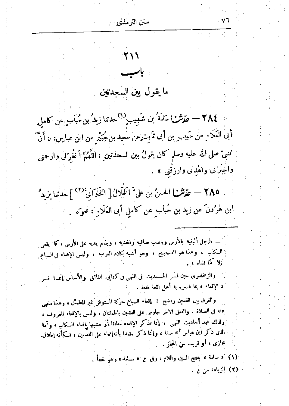 284 - حَدَّثَنَا سَلَمَةُ بْنُ شَبِيبٍ قَالَ: حَدَّثَنَا زَيْدُ بْنُ حُبَابٍ، عَنْ كَامِلٍ أَبِي العَلَاءِ، عَنْ حَبِيبِ بْنِ أَبِي ثَابِتٍ، عَنْ سَعِيدِ بْنِ جُبَيْرٍ، عَنْ ابْنِ عَبَّاسٍ، أَنَّ النَّبِيَّ صَلَّى اللَّهُ عَلَيْهِ وَسَلَّمَ كَانَ يَقُولُ بَيْنَ السَّجْدَتَيْنِ: «§اللَّهُمَّ اغْفِرْ لِي، وَارْحَمْنِي، وَاجْبُرْنِي، وَاهْدِنِي، وَارْزُقْنِي»،