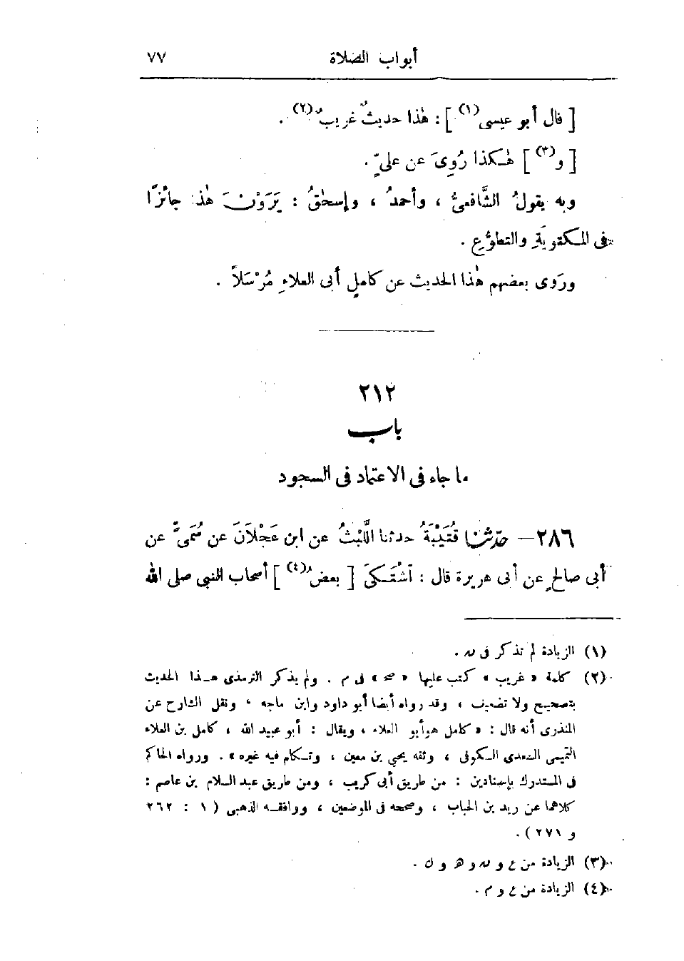 286 - حَدَّثَنَا قُتَيْبَةُ قَالَ: حَدَّثَنَا اللَّيْثُ، عَنْ ابْنِ عَجْلَانَ، عَنْ سُمَيٍّ، عَنْ أَبِي صَالِحٍ، عَنْ أَبِي هُرَيْرَةَ، قَالَ: اشْتَكَى أَصْحَابِ النَّبِيِّ صَلَّى اللَّهُ -[78]- عَلَيْهِ وَسَلَّمَ إِلَى النَّبِيِّ صَلَّى اللَّهُ عَلَيْهِ وَسَلَّمَ مَشَقَّةَ السُّجُودِ عَلَيْهِمْ إِذَا تَفَرَّجُوا، فَقَالَ: «§اسْتَعِينُوا بِالرُّكَبِ»، هَذَا حَدِيثٌ لَا نَعْرِفُهُ مِنْ حَدِيثِ أَبِي صَالِحٍ، عَنْ أَبِي هُرَيْرَةَ، عَنِ النَّبِيِّ صَلَّى اللَّهُ عَلَيْهِ وَسَلَّمَ إِلَّا مِنْ هَذَا الوَجْهِ، مِنْ حَدِيثِ اللَّيْثِ، عَنْ ابْنِ عَجْلَانَ وَقَدْ رَوَى هَذَا الحَدِيثَ سُفْيَانُ بْنُ عُيَيْنَةَ، وَغَيْرُ وَاحِدٍ، عَنْ سُمَيٍّ، عَنْ النُّعْمَانِ بْنِ أَبِي عَيَّاشٍ، عَنِ النَّبِيِّ صَلَّى اللَّهُ عَلَيْهِ وَسَلَّمَ، نَحْوَ هَذَا «وَكَأَنَّ رِوَايَةَ هَؤُلَاءِ أَصَحُّ مِنْ رِوَايَةِ اللَّيْثِ»