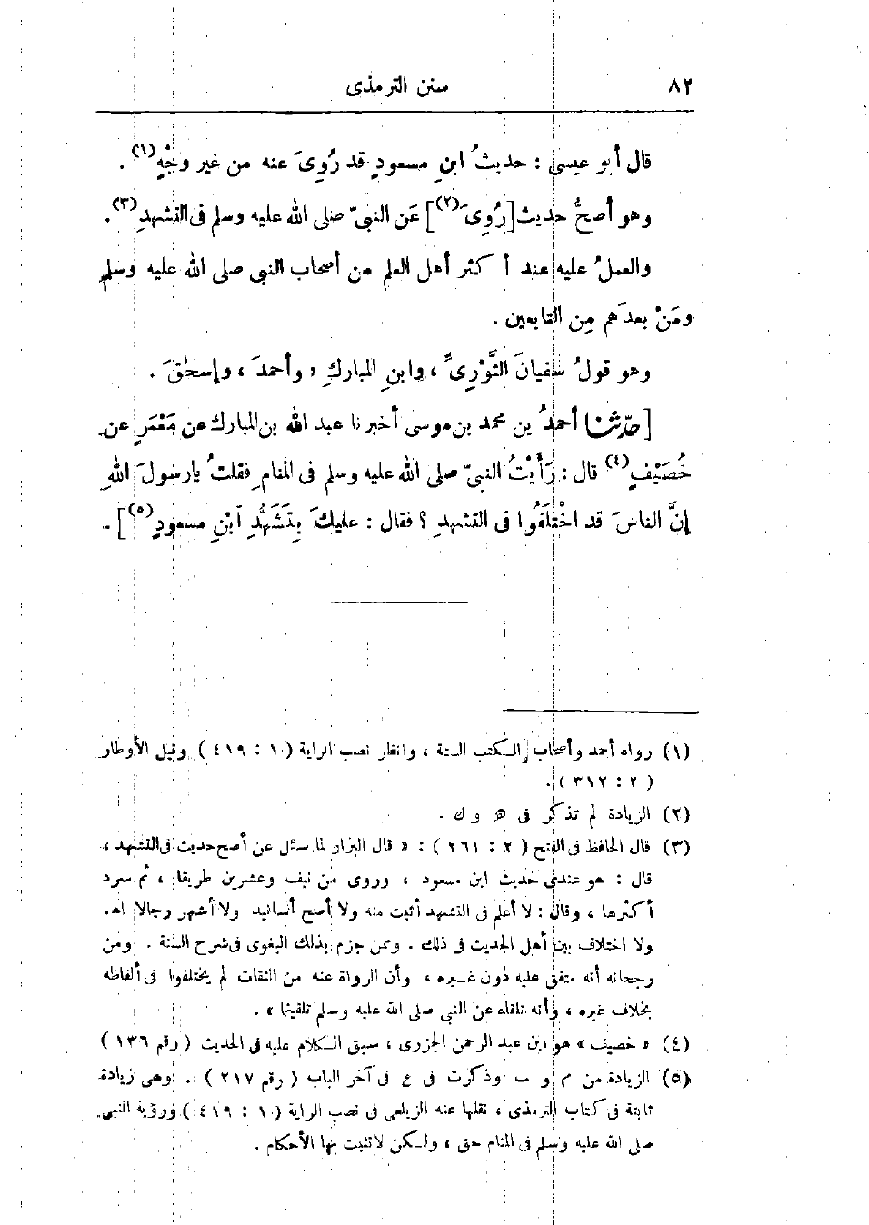 حَدَّثَنَا أَحْمَدُ بْنُ مُحَمَّدِ بْنِ مُوسَى قَالَ: أَخْبَرَنَا عَبْدُ اللَّهِ بْنُ المُبَارَكِ، عَنْ مَعْمَرٍ، عَنْ خُصَيْفٍ قَالَ: رَأَيْتُ النَّبِيَّ صَلَّى اللَّهُ عَلَيْهِ وَسَلَّمَ فِي المَنَامِ، فَقُلْتُ: يَا رَسُولَ اللَّهِ، إِنَّ النَّاسَ قَدْ اخْتَلَفُوا فِي التَّشَهُّدِ، فَقَالَ: «§عَلَيْكَ بِتَشَهُّدِ ابْنِ مَسْعُودٍ»