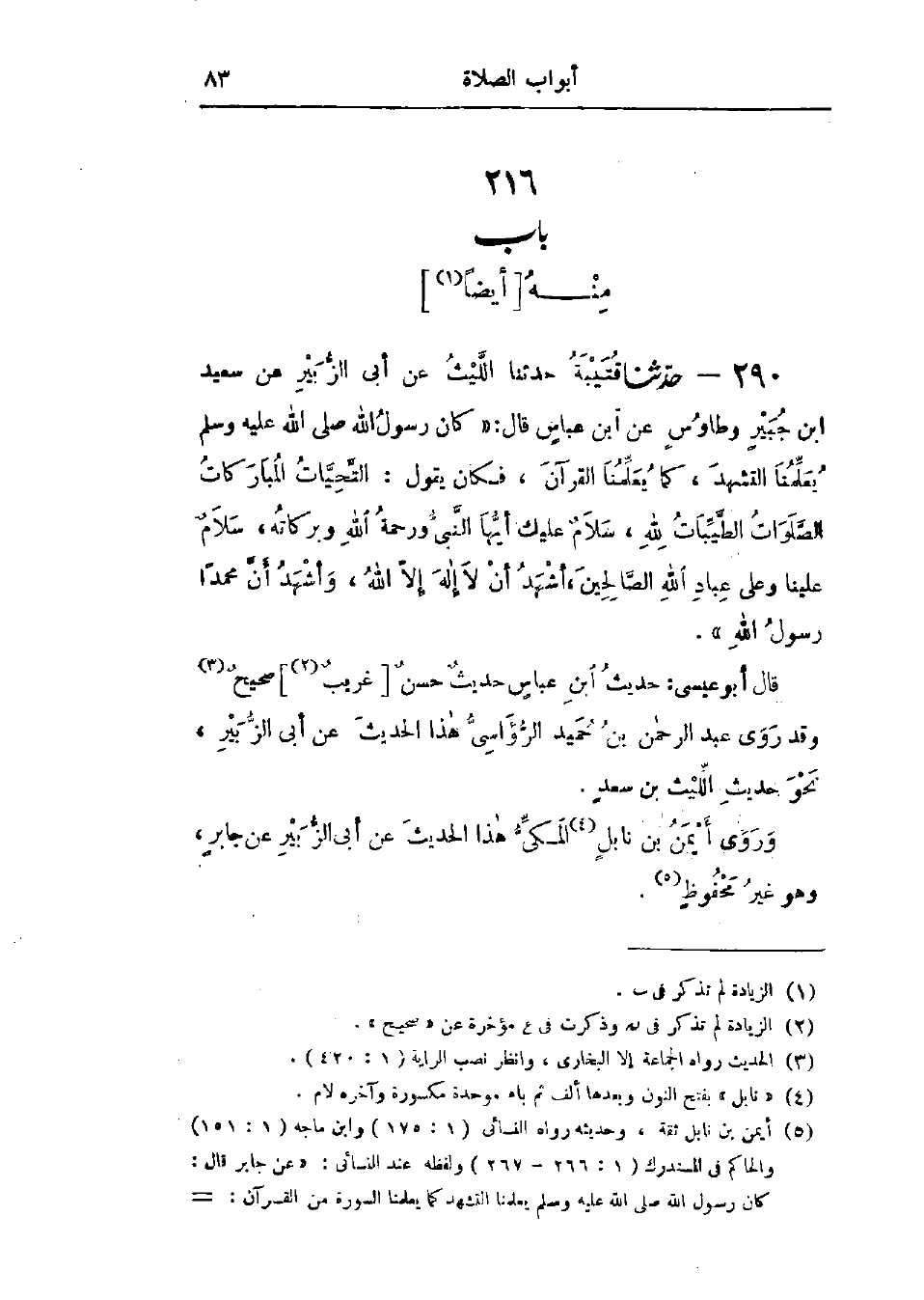 290 - حَدَّثَنَا قُتَيْبَةُ قَالَ: حَدَّثَنَا اللَّيْثُ، عَنْ أَبِي الزُّبَيْرِ، عَنْ سَعِيدِ بْنِ جُبَيْرٍ، وَطَاوُسٍ، عَنْ ابْنِ عَبَّاسٍ، قَالَ: كَانَ رَسُولُ اللَّهِ صَلَّى اللَّهُ عَلَيْهِ وَسَلَّمَ يُعَلِّمُنَا التَّشَهُّدَ كَمَا يُعَلِّمُنَا القُرْآنَ، فَكَانَ يَقُولُ: «§التَّحِيَّاتُ المُبَارَكَاتُ، الصَّلَوَاتُ الطَّيِّبَاتُ لِلَّهِ، سَلَامٌ عَلَيْكَ أَيُّهَا النَّبِيُّ وَرَحْمَةُ اللَّهِ وَبَرَكَاتُهُ، سَلَامٌ عَلَيْنَا وَعَلَى عِبَادِ اللَّهِ الصَّالِحِينَ، أَشْهَدُ أَنْ لَا إِلَهَ إِلَّا اللَّهُ، وَأَشْهَدُ أَنَّ مُحَمَّدًا رَسُولُ اللَّهِ»، «حَدِيثُ ابْنِ عَبَّاسٍ حَدِيثٌ حَسَنٌ صَحِيحٌ غَرِيبٌ» وَقَدْ رَوَى عَبْدُ الرَّحْمَنِ بْنُ حُمَيْدٍ الرُّؤَاسِيُّ هَذَا الحَدِيثَ، عَنْ أَبِي الزُّبَيْرِ نَحْوَ حَدِيثِ اللَّيْثِ بْنِ سَعْدٍ، وَرَوَى أَيْمَنُ بْنُ نَابِلٍ المَكِّيُّ هَذَا الحَدِيثَ، عَنْ أَبِي الزُّبَيْرِ، عَنْ جَابِرٍ «وَهُوَ غَيْرُ مَحْفُوظٍ، -[84]- وَذَهَبَ الشَّافِعِيُّ إِلَى حَدِيثِ ابْنِ عَبَّاسٍ فِي التَّشَهُّدِ»