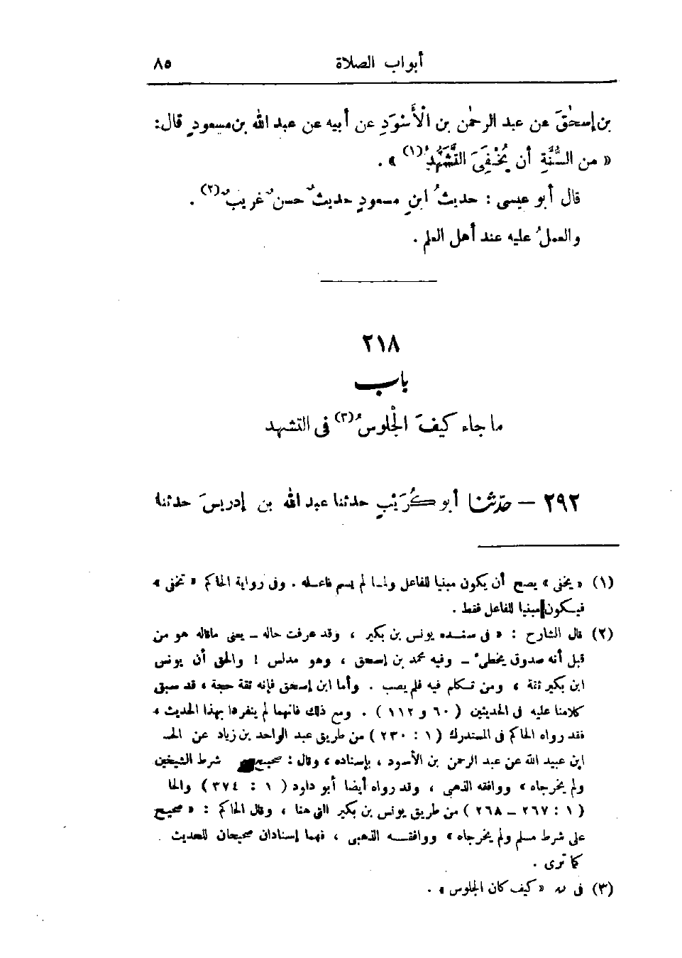 292 - حَدَّثَنَا أَبُو كُرَيْبٍ قَالَ: حَدَّثَنَا عَبْدُ اللَّهِ بْنُ إِدْرِيسَ، عَنْ -[86]- عَاصِمِ بْنِ كُلَيْبٍ، عَنْ أَبِيهِ، عَنْ وَائِلِ بْنِ حُجْرٍ، قَالَ: قَدِمْتُ المَدِينَةَ، قُلْتُ: لَأَنْظُرَنَّ إِلَى صَلَاةِ رَسُولِ اللَّهِ صَلَّى اللَّهُ عَلَيْهِ وَسَلَّمَ، فَلَمَّا جَلَسَ - يَعْنِي لِلتَّشَهُّدِ -: §افْتَرَشَ رِجْلَهُ اليُسْرَى، وَوَضَعَ يَدَهُ اليُسْرَى - يَعْنِي - عَلَى فَخِذِهِ اليُسْرَى، وَنَصَبَ رِجْلَهُ اليُمْنَى. هَذَا حَدِيثٌ حَسَنٌ صَحِيحٌ، وَالعَمَلُ عَلَيْهِ عِنْدَ أَكْثَرِ أَهْلِ العِلْمِ، وَهُوَ قَوْلُ سُفْيَانَ الثَّوْرِيِّ، وَأَهْلِ الكُوفَةِ، وَابْنِ المُبَارَكِ