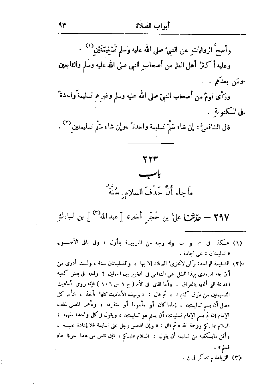 297 - حَدَّثَنَا عَلِيُّ بْنُ حُجْرٍ قَالَ: حَدَّثَنَا عَبْدُ اللَّهِ بْنُ المُبَارَكِ، -[94]- وَهِقْلُ بْنُ زِيَادٍ، عَنْ الأَوْزَاعِيِّ، عَنْ قُرَّةَ بْنِ عَبْدِ الرَّحْمَنِ، عَنْ الزُّهْرِيِّ، عَنْ أَبِي سَلَمَةَ، عَنْ أَبِي هُرَيْرَةَ، قَالَ: «§حَذْفُ السَّلَامِ سُنَّةٌ» قَالَ عَلِيُّ بْنُ حُجْرٍ: وَقَالَ ابْنُ المُبَارَكِ: " يَعْنِي: أَنْ لَا تَمُدَّهُ مَدًّا «هَذَا حَدِيثٌ حَسَنٌ صَحِيحٌ، -[95]- وَهُوَ الَّذِي يَسْتَحِبُّهُ أَهْلُ العِلْمِ» وَرُوِيَ عَنْ إِبْرَاهِيمَ النَّخَعِيِّ أَنَّهُ قَالَ: «التَّكْبِيرُ جَزْمٌ، وَالسَّلَامُ جَزْمٌ» وَهِقْلٌ يُقَالُ: كَانَ كَاتِبَ الأَوْزَاعِيِّ "