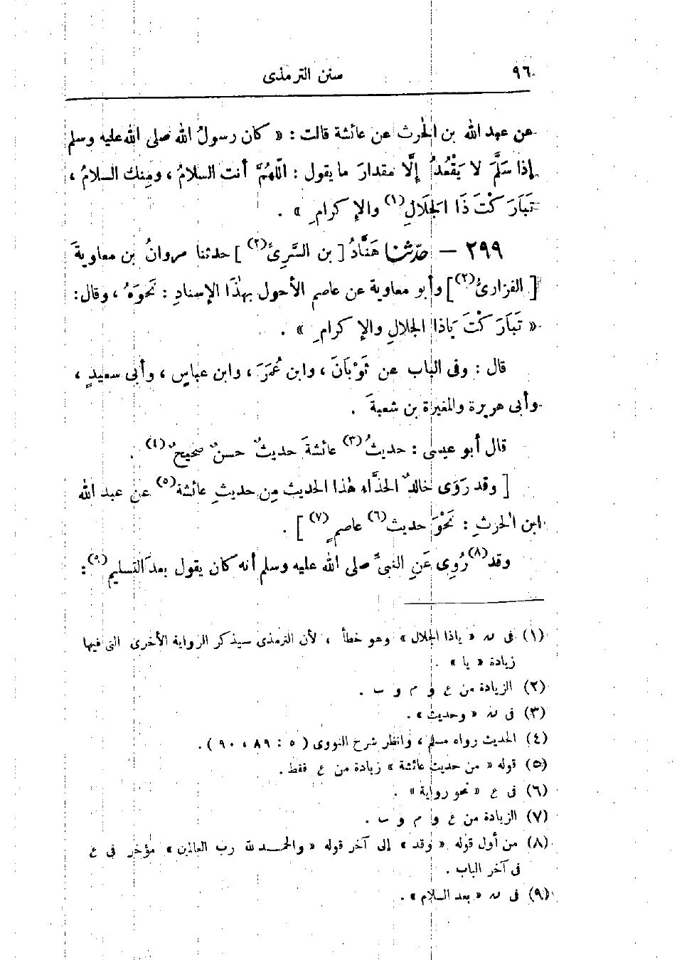 299 - حَدَّثَنَا هَنَّادٌ قَالَ: حَدَّثَنَا مَرْوَانُ بْنُ مُعَاوِيَةَ، وَأَبُو مُعَاوِيَةَ، عَنْ عَاصِمٍ الأَحْوَلِ، بِهَذَا الإِسْنَادِ نَحْوَهُ، وَقَالَ: «تَبَارَكْتَ يَا ذَا الجَلَالِ وَالإِكْرَامِ»، وَفِي البَابِ عَنْ ثَوْبَانَ، وَابْنِ عُمَرَ، وَابْنِ عَبَّاسٍ، وَأَبِي سَعِيدٍ، وَأَبِي هُرَيْرَةَ، وَالمُغِيرَةِ بْنِ شُعْبَةَ، «حَدِيثُ عَائِشَةَ حَدِيثٌ حَسَنٌ صَحِيحٌ» وَقَدْ رَوَى خَالِدٌ الحَذَّاءُ هَذَا الحَدِيثَ، مِنْ حَدِيثِ عَائِشَةَ، عَنْ عَبْدِ اللَّهِ بْنِ الحَارِثِ نَحْوَ، حَدِيثِ عَاصِمٍ وَقَدْ رُوِيَ عَنِ النَّبِيِّ صَلَّى اللَّهُ عَلَيْهِ وَسَلَّمَ أَنَّهُ كَانَ يَقُولُ بَعْدَ التَّسْلِيمِ: -[97]- «لَا إِلَهَ إِلَّا اللَّهُ وَحْدَهُ لَا شَرِيكَ لَهُ، لَهُ المُلْكُ وَلَهُ الحَمْدُ، يُحْيِي وَيُمِيتُ، وَهُوَ عَلَى كُلِّ شَيْءٍ قَدِيرٌ، اللَّهُمَّ لَا مَانِعَ لِمَا أَعْطَيْتَ، وَلَا مُعْطِيَ لِمَا مَنَعْتَ، وَلَا يَنْفَعُ ذَا الجَدِّ مِنْكَ الجَدُّ» وَرُوِيَ أَنَّهُ كَانَ يَقُولُ: «سُبْحَانَ رَبِّكَ رَبِّ العِزَّةِ عَمَّا يَصِفُونَ، وَسَلَامٌ عَلَى المُرْسَلِينَ وَالحَمْدُ لِلَّهِ رَبِّ العَالَمِينَ»