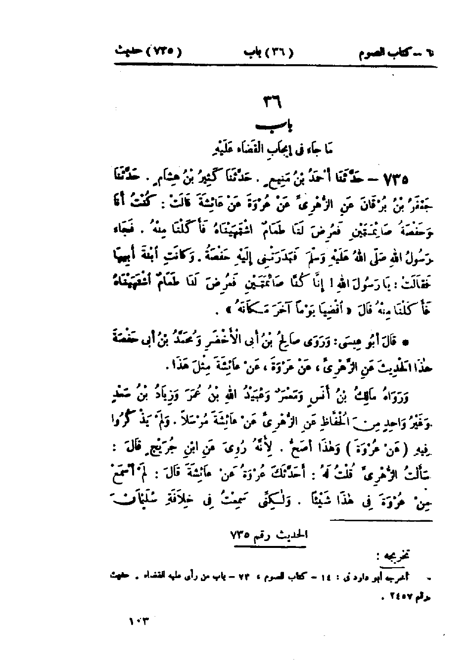 735 - حَدَّثَنَا أَحْمَدُ بْنُ مَنِيعٍ قَالَ: حَدَّثَنَا كَثِيرُ بْنُ هِشَامٍ قَالَ: حَدَّثَنَا جَعْفَرُ بْنُ بُرْقَانَ، عَنْ الزُّهْرِيِّ، عَنْ عُرْوَةَ، عَنْ عَائِشَةَ قَالَتْ: كُنْتُ أَنَا وَحَفْصَةُ صَائِمَتَيْنِ، فَعُرِضَ لَنَا طَعَامٌ اشْتَهَيْنَاهُ فَأَكَلْنَا مِنْهُ، فَجَاءَ رَسُولُ اللَّهِ صَلَّى اللَّهُ عَلَيْهِ وَسَلَّمَ، فَبَدَرَتْنِي إِلَيْهِ حَفْصَةُ، وَكَانَتْ ابْنَةَ أَبِيهَا، فَقَالَتْ: يَا رَسُولَ اللَّهِ، إِنَّا كُنَّا صَائِمَتَيْنِ، فَعُرِضَ لَنَا طَعَامٌ اشْتَهَيْنَاهُ فَأَكَلْنَا مِنْهُ، قَالَ: «§اقْضِيَا يَوْمًا آخَرَ مَكَانَهُ»: وَرَوَى صَالِحُ بْنُ أَبِي الأَخْضَرِ، وَمُحَمَّدُ بْنُ أَبِي حَفْصَةَ هَذَا الحَدِيثَ، عَنِ الزُّهْرِيِّ، عَنْ عُرْوَةَ، عَنْ عَائِشَةَ مِثْلَ هَذَا، وَرَوَاهُ مَالِكُ بْنُ أَنَسٍ، وَمَعْمَرٌ، وَعُبَيْدُ اللَّهِ بْنُ عُمَرَ، وَزِيَادُ بْنُ سَعْدٍ، وَغَيْرُ وَاحِدٍ مِنَ الحُفَّاظِ، عَنْ الزُّهْرِيِّ، عَنْ عَائِشَةَ مُرْسَلًا، وَلَمْ يَذْكُرُوا فِيهِ عَنْ عُرْوَةَ، وَهَذَا أَصَحُّ لِأَنَّهُ رُوِيَ عَنْ ابْنِ جُرَيْجٍ قَالَ: سَأَلْتُ الزُّهْرِيَّ قُلْتُ لَهُ: أَحَدَّثَكَ عُرْوَةُ عَنْ عَائِشَةَ؟ قَالَ: لَمْ أَسْمَعْ مِنْ عُرْوَةَ فِي هَذَا شَيْئًا، وَلَكِنِّي سَمِعْتُ فِي خِلَافَةِ سُلَيْمَانَ -[104]- بْنِ عَبْدِ المَلِكِ مِنْ نَاسٍ، عَنْ بَعْضِ مَنْ سَأَلَ عَائِشَةَ عَنْ هَذَا الحَدِيثِ، حَدَّثَنَا بِذَلِكَ عَلِيُّ بْنُ عِيسَى بْنِ يَزِيدَ البَغْدَادِيُّ قَالَ: حَدَّثَنَا رَوْحُ بْنُ عُبَادَةَ، عَنْ ابْنِ جُرَيْجٍ فَذَكَرَ الحَدِيثَ، «وَقَدْ ذَهَبَ قَوْمٌ مِنْ أَهْلِ العِلْمِ مِنْ أَصْحَابِ النَّبِيِّ صَلَّى اللَّهُ عَلَيْهِ وَسَلَّمَ وَغَيْرِهِمْ إِلَى هَذَا الحَدِيثِ فَرَأَوْا عَلَيْهِ القَضَاءَ إِذَا أَفْطَرَ وَهُوَ قَوْلُ مَالِكِ بْنِ أَنَسٍ»