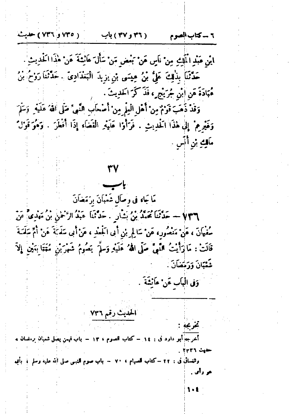 736 - حَدَّثَنَا مُحَمَّدُ بْنُ بَشَّارٍ قَالَ: حَدَّثَنَا عَبْدُ الرَّحْمَنِ بْنُ مَهْدِيٍّ، عَنْ سُفْيَانَ، عَنْ مَنْصُورٍ، عَنْ سَالِمِ بْنِ أَبِي الجَعْدِ، عَنْ أَبِي سَلَمَةَ، عَنْ أُمِّ سَلَمَةَ قَالَتْ: «§مَا رَأَيْتُ النَّبِيَّ صَلَّى اللَّهُ عَلَيْهِ وَسَلَّمَ يَصُومُ شَهْرَيْنِ مُتَتَابِعَيْنِ إِلَّا شَعْبَانَ وَرَمَضَانَ» وَفِي البَابِ عَنْ عَائِشَةَ.: -[105]- «حَدِيثُ أُمِّ سَلَمَةَ حَدِيثٌ حَسَنٌ»