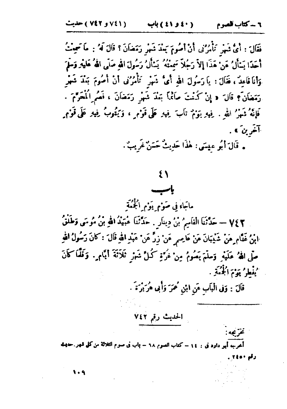 742 - حَدَّثَنَا القَاسِمُ بْنُ دِينَارٍ قَالَ: حَدَّثَنَا عُبَيْدُ اللَّهِ بْنُ مُوسَى، وَطَلْقُ بْنُ غَنَّامٍ، عَنْ شَيْبَانَ، عَنْ عَاصِمٍ، عَنْ زِرٍّ، عَنْ عَبْدِ اللَّهِ قَالَ: كَانَ رَسُولُ اللَّهِ صَلَّى اللَّهُ عَلَيْهِ وَسَلَّمَ «§يَصُومُ مِنْ غُرَّةِ كُلِّ شَهْرٍ ثَلَاثَةَ أَيَّامٍ، وَقَلَّمَا كَانَ يُفْطِرُ يَوْمَ الجُمُعَةِ» وَفِي البَابِ عَنْ ابْنِ عُمَرَ، وأَبِي هُرَيْرَةَ.: -[110]- «حَدِيثُ عَبْدِ اللَّهِ حَدِيثٌ حَسَنٌ غَرِيبٌ» وَقَدْ اسْتَحَبَّ قَوْمٌ مِنْ أَهْلِ العِلْمِ صِيَامَ يَوْمِ الجُمُعَةِ، وَإِنَّمَا يُكْرَهُ أَنْ يَصُومَ يَوْمَ الجُمُعَةِ لَا يَصُومُ قَبْلَهُ وَلَا بَعْدَهُ " وَرَوَى شُعْبَةُ، عَنْ عَاصِمٍ هَذَا الحَدِيثَ وَلَمْ يَرْفَعْهُ