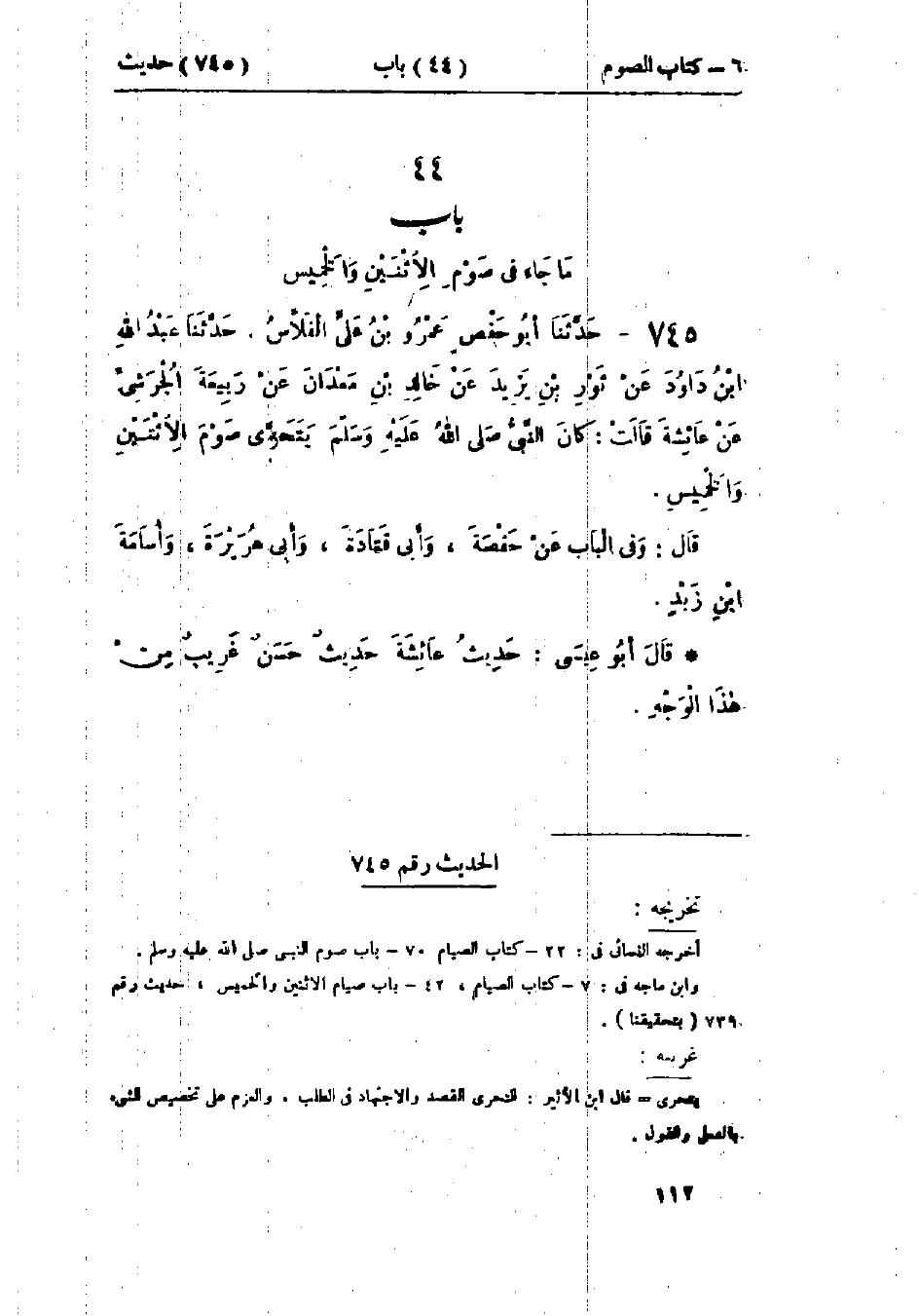745 - حَدَّثَنَا أَبُو حَفْصٍ، عَمْرُو بْنُ عَلِيٍّ الفَلَّاسُ قَالَ: حَدَّثَنَا عَبْدُ اللَّهِ بْنُ دَاوُدَ، عَنْ ثَوْرِ بْنِ يَزِيدَ، عَنْ خَالِدِ بْنِ مَعْدَانَ، عَنْ رَبِيعَةَ الجُرَشِيِّ، عَنْ عَائِشَةَ قَالَتْ: «كَانَ النَّبِيُّ صَلَّى اللَّهُ عَلَيْهِ وَسَلَّمَ §يَتَحَرَّى صَوْمَ الِاثْنَيْنِ وَالخَمِيسِ» وَفِي البَابِ عَنْ حَفْصَةَ، وَأَبِي قَتَادَةَ، وَأَبِي هُرَيْرَةَ، وَأُسَامَةَ بْنِ زَيْدٍ.: «حَدِيثُ عَائِشَةَ حَدِيثٌ حَسَنٌ غَرِيبٌ مِنْ هَذَا الوَجْهِ»