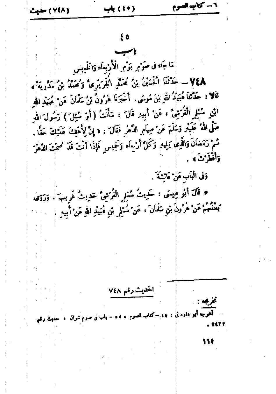748 - حَدَّثَنَا الحُسَيْنُ بْنُ مُحَمَّدٍ الجُرَيْرِيُّ، وَمُحَمَّدُ بْنُ مَدُّوَيْهِ قَالَا: حَدَّثَنَا عُبَيْدُ اللَّهِ بْنُ مُوسَى قَالَ: أَخْبَرَنَا هَارُونُ بْنُ سَلْمَانَ، عَنْ عُبَيْدِ اللَّهِ بْنِ مُسْلِمٍ القُرَشِيِّ، عَنْ أَبِيهِ قَالَ: سَأَلْتُ، أَوْ سُئِلَ رَسُولُ اللَّهِ صَلَّى اللَّهُ عَلَيْهِ وَسَلَّمَ عَنْ صِيَامِ الدَّهْرِ؟ فَقَالَ: «§إِنَّ لِأَهْلِكَ عَلَيْكَ حَقًّا، صُمْ رَمَضَانَ، وَالَّذِي يَلِيهِ، وَكُلَّ أَرْبِعَاءَ وَخَمِيسٍ، فَإِذَا أَنْتَ قَدْ صُمْتَ الدَّهْرَ وَأَفْطَرْتَ» وَفِي البَابِ عَنْ عَائِشَةَ.: «حَدِيثُ مُسْلِمٍ القُرَشِيِّ حَدِيثٌ غَرِيبٌ» وَرَوَى بَعْضُهُمْ، عَنْ هَارُونَ بْنِ سَلْمَانَ، عَنْ مُسْلِمِ بْنِ عُبَيْدِ اللَّهِ، عَنْ أَبِيهِ