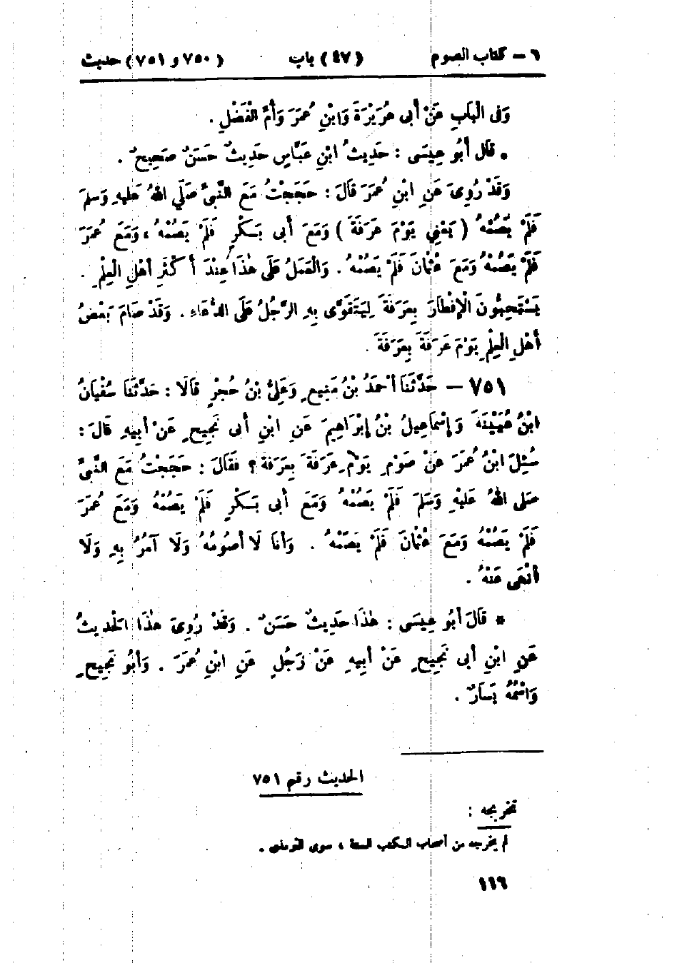 751 - حَدَّثَنَا أَحْمَدُ بْنُ مَنِيعٍ، وَعَلِيُّ بْنُ حُجْرٍ، قَالَا: حَدَّثَنَا سُفْيَانُ بْنُ عُيَيْنَةَ، وَإِسْمَاعِيلُ بْنُ إِبْرَاهِيمَ، عَنْ ابْنِ أَبِي نَجِيحٍ، عَنْ أَبِيهِ، قَالَ: سُئِلَ ابْنُ عُمَرَ عَنْ صَوْمِ يَوْمِ عَرَفَةَ بِعَرَفَةَ، فَقَالَ: «§حَجَجْتُ مَعَ النَّبِيِّ صَلَّى اللَّهُ عَلَيْهِ وَسَلَّمَ فَلَمْ يَصُمْهُ»، وَمَعَ أَبِي بَكْرٍ فَلَمْ يَصُمْهُ، وَمَعَ عُمَرَ فَلَمْ يَصُمْهُ، وَمَعَ عُثْمَانَ فَلَمْ يَصُمْهُ، وَأَنَا لَا أَصُومُهُ، وَلَا آمُرُ بِهِ، وَلَا أَنْهَى عَنْهُ: «هَذَا حَدِيثٌ حَسَنٌ»، وَقَدْ رُوِيَ هَذَا الحَدِيثُ أَيْضًا عَنْ ابْنِ أَبِي نَجِيحٍ، عَنْ أَبِيهِ، عَنْ رَجُلٍ، عَنْ ابْنِ عُمَرَ، " وَأَبُو نَجِيحٍ: اسْمُهُ يَسَارٌ قَدْ سَمِعَ مِنْ ابْنِ عُمَرَ "