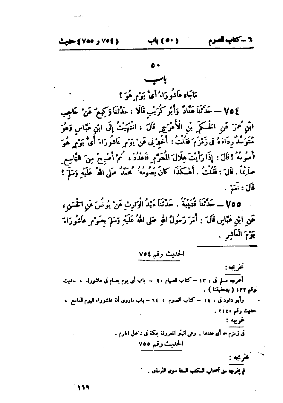 754 - حَدَّثَنَا هَنَّادٌ، وَأَبُو كُرَيْبٍ، قَالَا: حَدَّثَنَا وَكِيعٌ، عَنْ حَاجِبِ بْنِ عُمَرَ، عَنْ الحَكَمِ بْنِ الأَعْرَجِ، قَالَ: انْتَهَيْتُ إِلَى ابْنِ عَبَّاسٍ وَهُوَ مُتَوَسِّدٌ رِدَاءَهُ فِي زَمْزَمَ، فَقُلْتُ: أَخْبِرْنِي عَنْ يَوْمِ عَاشُورَاءَ، أَيُّ يَوْمٍ أَصُومُهُ؟ قَالَ: «§إِذَا رَأَيْتَ هِلَالَ المُحَرَّمِ فَاعْدُدْ، ثُمَّ أَصْبِحْ مِنَ التَّاسِعِ صَائِمًا»، قَالَ: فَقُلْتُ: أَهَكَذَا كَانَ يَصُومُهُ مُحَمَّدٌ صَلَّى اللَّهُ عَلَيْهِ وَسَلَّمَ؟ قَالَ: «نَعَمْ»