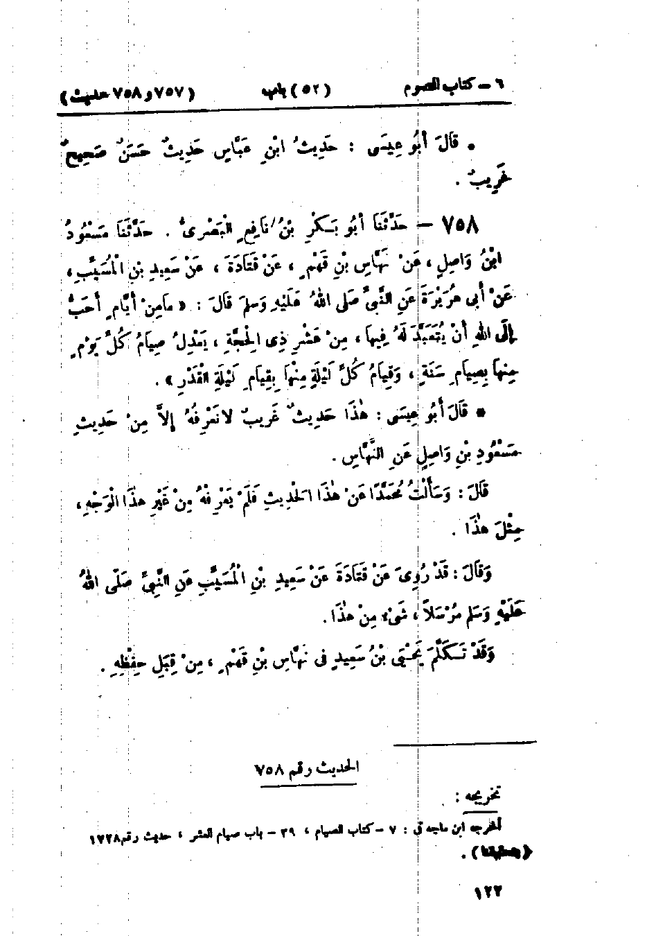 758 - حَدَّثَنَا أَبُو بَكْرِ بْنُ نَافِعٍ البَصْرِيُّ قَالَ: حَدَّثَنَا مَسْعُودُ بْنُ وَاصِلٍ، عَنْ نَهَّاسِ بْنِ قَهْمٍ، عَنْ قَتَادَةَ، عَنْ سَعِيدِ بْنِ المُسَيِّبِ، عَنْ أَبِي هُرَيْرَةَ، عَنِ النَّبِيِّ صَلَّى اللَّهُ عَلَيْهِ وَسَلَّمَ قَالَ: «§مَا مِنْ أَيَّامٍ أَحَبُّ إِلَى اللَّهِ أَنْ يُتَعَبَّدَ لَهُ فِيهَا مِنْ عَشْرِ ذِي الحِجَّةِ، يَعْدِلُ صِيَامُ كُلِّ يَوْمٍ مِنْهَا بِصِيَامِ سَنَةٍ، وَقِيَامُ كُلِّ لَيْلَةٍ مِنْهَا بِقِيَامِ لَيْلَةِ القَدْرِ»: «هَذَا حَدِيثٌ غَرِيبٌ لَا نَعْرِفُهُ إِلَّا مِنْ حَدِيثِ مَسْعُودِ بْنِ وَاصِلٍ، عَنِ النَّهَّاسِ». وَسَأَلْتُ مُحَمَّدًا، عَنْ هَذَا الحَدِيثِ فَلَمْ يَعْرِفْهُ مِنْ غَيْرِ هَذَا الوَجْهِ مِثْلَ هَذَا وَقَدْ رُوِيَ عَنْ قَتَادَةَ، عَنْ سَعِيدِ بْنِ المُسَيِّبِ، عَنِ النَّبِيِّ صَلَّى اللَّهُ عَلَيْهِ وَسَلَّمَ مُرْسَلًا شَيْءٌ مِنْ هَذَا «وَقَدْ تَكَلَّمَ يَحْيَى بْنُ سَعِيدٍ فِي نَهَّاسِ بْنِ قَهْمٍ مِنْ قِبَلِ حِفْظِهِ»