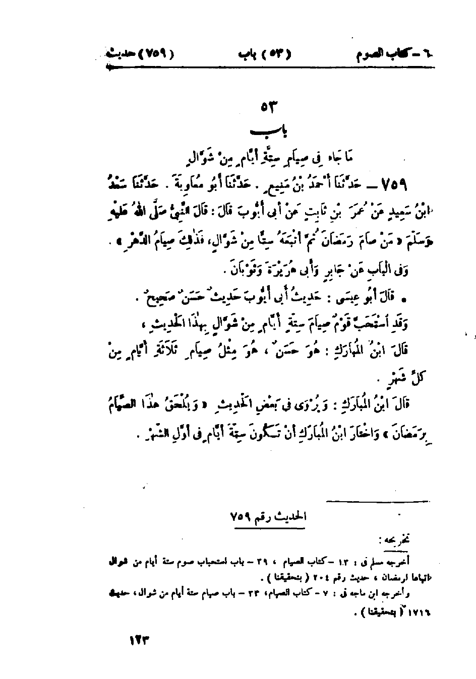 759 - حَدَّثَنَا أَحْمَدُ بْنُ مَنِيعٍ قَالَ: حَدَّثَنَا أَبُو مُعَاوِيَةَ قَالَ: حَدَّثَنَا سَعْدُ بْنُ سَعِيدٍ، عَنْ عُمَرَ بْنِ ثَابِتٍ، عَنْ أَبِي أَيُّوبَ قَالَ: قَالَ النَّبِيُّ صَلَّى اللَّهُ عَلَيْهِ وَسَلَّمَ: «§مَنْ صَامَ رَمَضَانَ ثُمَّ أَتْبَعَهُ سِتًّا مِنْ شَوَّالٍ فَذَلِكَ صِيَامُ الدَّهْرِ» وَفِي البَابِ عَنْ جَابِرٍ، وَأَبِي هُرَيْرَةَ، وَثَوْبَانَ.: «حَدِيثُ أَبِي أَيُّوبَ حَدِيثٌ حَسَنٌ صَحِيحٌ»، «وَقَدْ اسْتَحَبَّ قَوْمٌ صِيَامَ سِتَّةِ أَيَّامٍ مِنْ شَوَّالٍ بِهَذَا الحَدِيثِ». قَالَ ابْنُ المُبَارَكِ: «هُوَ حَسَنٌ هُوَ مِثْلُ صِيَامِ ثَلَاثَةِ أَيَّامٍ مِنْ كُلِّ شَهْرٍ». قَالَ ابْنُ المُبَارَكِ: «وَيُرْوَى فِي بَعْضِ الحَدِيثِ وَيُلْحَقُ هَذَا الصِّيَامُ بِرَمَضَانَ»، «وَاخْتَارَ ابْنُ المُبَارَكِ أَنْ تَكُونَ سِتَّةَ أَيَّامٍ فِي أَوَّلِ الشَّهْرِ»، -[124]- وَقَدْ رُوِيَ عَنْ ابْنِ المُبَارَكِ أَنَّهُ قَالَ: «إِنْ صَامَ سِتَّةَ أَيَّامٍ مِنْ شَوَّالٍ مُتَفَرِّقًا فَهُوَ جَائِزٌ». وَقَدْ رَوَى عَبْدُ العَزِيزِ بْنُ مُحَمَّدٍ، عَنْ صَفْوَانَ بْنِ سُلَيْمٍ، وَسَعْدِ بْنِ سَعِيدٍ، عَنْ عُمَرَ بْنِ ثَابِتٍ، عَنْ أَبِي أَيُّوبَ، عَنِ النَّبِيِّ صَلَّى اللَّهُ عَلَيْهِ وَسَلَّمَ هَذَا، وَرَوَى شُعْبَةُ، عَنْ وَرْقَاءَ بْنِ عُمَرَ، عَنْ سَعْدِ بْنِ سَعِيدٍ هَذَا الحَدِيثَ، «وَسَعْدُ بْنُ سَعِيدٍ هُوَ أَخُو يَحْيَى بْنِ سَعِيدٍ الأَنْصَارِيِّ وَقَدْ تَكَلَّمَ بَعْضُ أَهْلِ الحَدِيثِ فِي سَعْدِ بْنِ سَعِيدٍ مِنْ قِبَلِ حِفْظِهِ». حَدَّثَنَا هَنَّادٌ قَالَ: أَخْبَرَنَا الحُسَيْنُ بْنُ عَلِيٍّ الجُعْفِيُّ، عَنْ إِسْرَائِيلَ أَبِي مُوسَى، عَنِ الحَسَنِ البَصْرِيِّ قَالَ: كَانَ إِذَا ذُكِرَ عِنْدَهُ صِيَامُ سِتَّةِ أَيَّامٍ مِنْ شَوَّالٍ، فَيَقُولُ: «وَاللَّهِ لَقَدْ رَضِيَ اللَّهُ بِصِيَامِ هَذَا الشَّهْرِ عَنِ السَّنَةِ كُلِّهَا»
