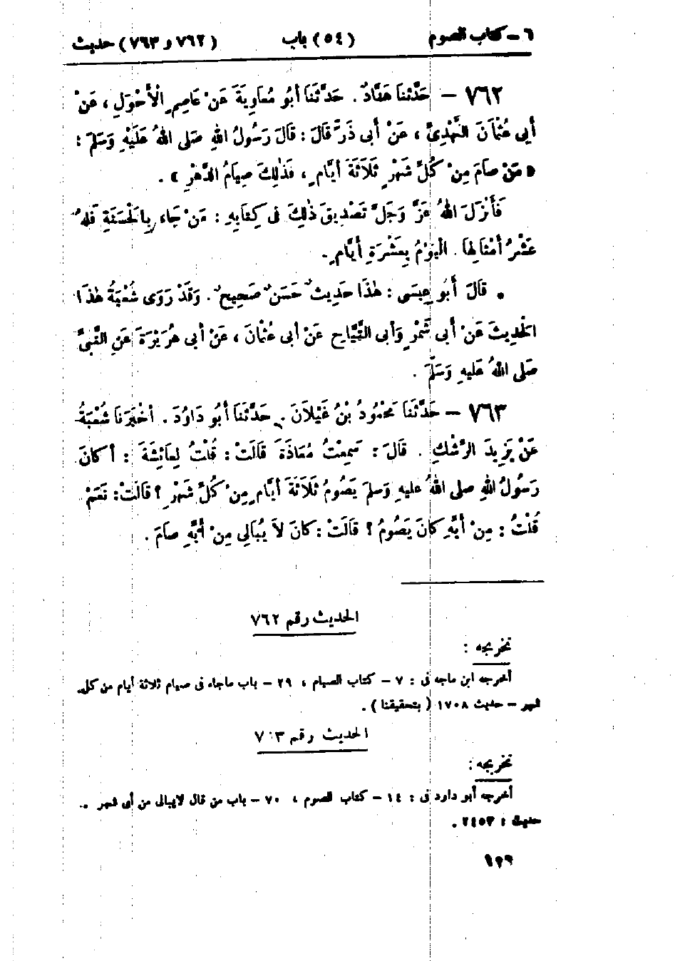 762 - حَدَّثَنَا هَنَّادٌ قَالَ: حَدَّثَنَا أَبُو مُعَاوِيَةَ، عَنْ عَاصِمٍ الأَحْوَلِ، عَنْ أَبِي عُثْمَانَ النَّهْدِيِّ، عَنْ أَبِي ذَرٍّ قَالَ: قَالَ رَسُولُ اللَّهِ صَلَّى اللَّهُ عَلَيْهِ وَسَلَّمَ: " §مَنْ صَامَ مِنْ كُلِّ شَهْرٍ ثَلَاثَةَ أَيَّامٍ فَذَلِكَ صِيَامُ الدَّهْرِ، فَأَنْزَلَ اللَّهُ عَزَّ وَجَلَّ تَصْدِيقَ ذَلِكَ فِي كِتَابِهِ: {مَنْ جَاءَ بِالحَسَنَةِ فَلَهُ عَشْرُ أَمْثَالِهَا} [الأنعام: 160] اليَوْمُ بِعَشْرَةِ أَيَّامٍ ": «هَذَا حَدِيثٌ حَسَنٌ» وَقَدْ رَوَى شُعْبَةُ هَذَا الحَدِيثَ، عَنْ أَبِي شِمْرٍ، وَأَبِي التَّيَّاحِ، عَنْ أَبِي عُثْمَانَ، عَنْ أَبِي هُرَيْرَةَ، عَنِ النَّبِيِّ صَلَّى اللَّهُ عَلَيْهِ وَسَلَّمَ