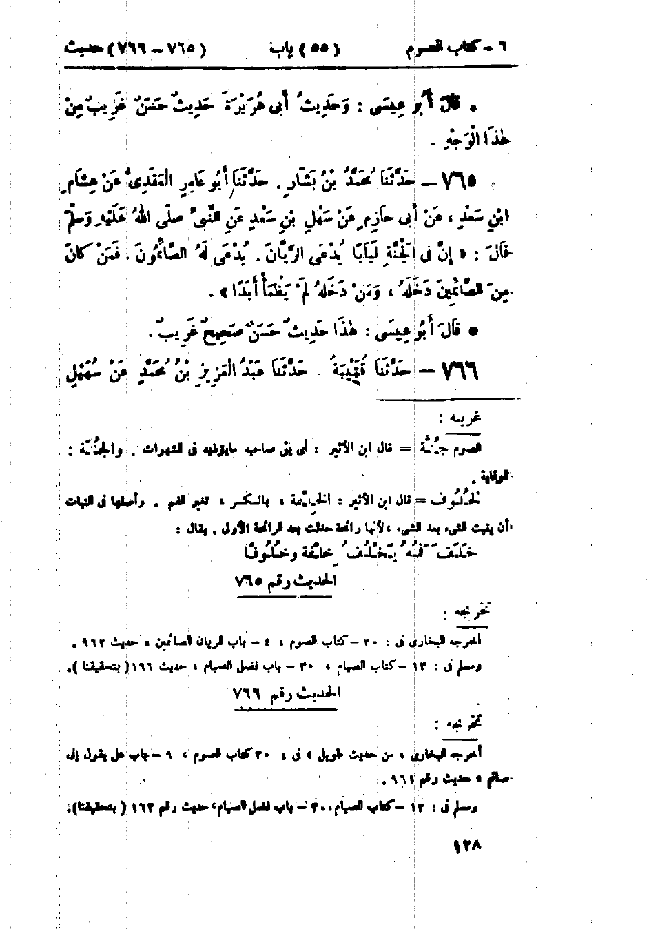 765 - حَدَّثَنَا مُحَمَّدُ بْنُ بَشَّارٍ قَالَ: حَدَّثَنَا أَبُو عَامِرٍ العَقَدِيُّ، عَنْ هِشَامِ بْنِ سَعْدٍ، عَنْ أَبِي حَازِمٍ، عَنْ سَهْلِ بْنِ سَعْدٍ، عَنْ النَّبِيِّ صَلَّى اللَّهُ عَلَيْهِ وَسَلَّمَ قَالَ: «إِنَّ §فِي الجَنَّةِ لَبَابًا يُدْعَى الرَّيَّانَ، يُدْعَى لَهُ الصَّائِمُونَ، فَمَنْ كَانَ مِنَ الصَّائِمِينَ دَخَلَهُ، وَمَنْ دَخَلَهُ لَمْ يَظْمَأْ أَبَدًا»: «هَذَا حَدِيثٌ حَسَنٌ صَحِيحٌ غَرِيبٌ»