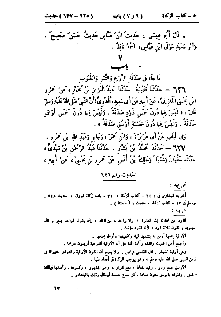 626 - حَدَّثَنَا قُتَيْبَةُ قَالَ: حَدَّثَنَا عَبْدُ العَزِيزِ بْنُ مُحَمَّدٍ، عَنْ عَمْرِو بْنِ يَحْيَى المَازِنِيِّ، عَنْ أَبِيهِ، عَنْ أَبِي سَعِيدٍ الخُدْرِيِّ، أَنَّ النَّبِيَّ صَلَّى اللَّهُ عَلَيْهِ وَسَلَّمَ قَالَ: «§لَيْسَ فِيمَا دُونَ خَمْسِ ذَوْدٍ صَدَقَةٌ، وَلَيْسَ فِيمَا دُونَ خَمْسِ أَوَاقٍ صَدَقَةٌ، وَلَيْسَ فِيمَا دُونَ خَمْسَةِ أَوْسُقٍ صَدَقَةٌ». وَفِي البَابِ عَنْ أَبِي هُرَيْرَةَ، وَابْنِ عُمَرَ، وَجَابِرٍ، وَعَبْدِ اللَّهِ بْنِ عَمْرٍو.