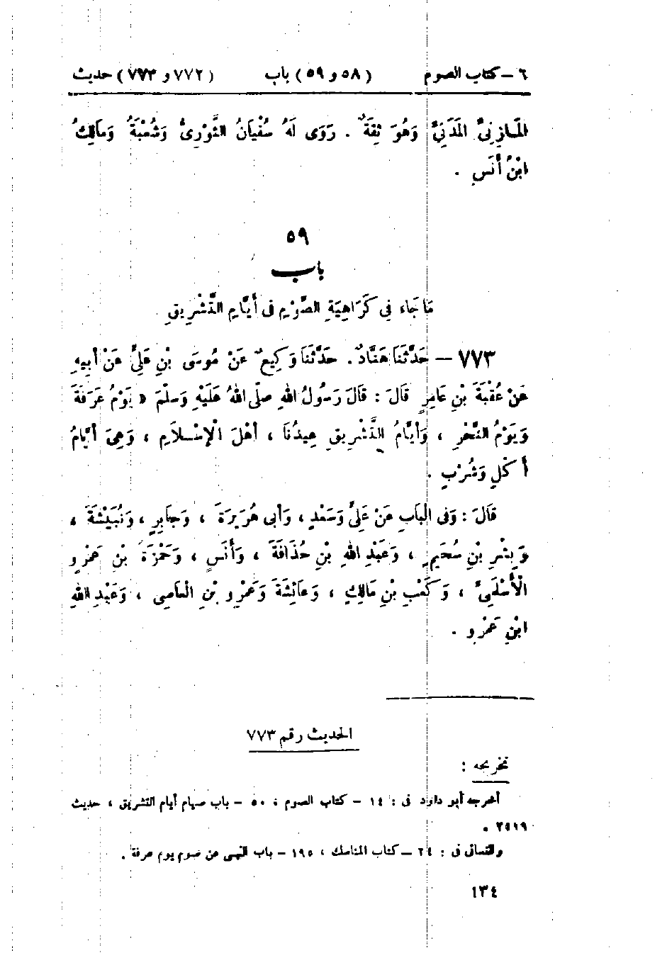 773 - حَدَّثَنَا هَنَّادٌ قَالَ: حَدَّثَنَا وَكِيعٌ، عَنْ مُوسَى بْنِ عَلِيٍّ، عَنْ أَبِيهِ، عَنْ عُقْبَةَ بْنِ عَامِرٍ قَالَ: قَالَ رَسُولُ اللَّهِ صَلَّى اللَّهُ عَلَيْهِ وَسَلَّمَ: «§يَوْمُ عَرَفَةَ، وَيَوْمُ النَّحْرِ، وَأَيَّامُ التَّشْرِيقِ، عِيدُنَا أَهْلَ الإِسْلَامِ، وَهِيَ أَيَّامُ أَكْلٍ وَشُرْبٍ» وَفِي البَابِ عَنْ عَلِيٍّ، وَسَعْدٍ، وَأَبِي هُرَيْرَةَ، وَجَابِرٍ، وَنُبَيْشَةَ، وَبِشْرِ بْنِ سُحَيْمٍ، وَعَبْدِ اللَّهِ بْنِ حُذَافَةَ، وَأَنَسٍ، وَحَمْزَةَ بْنِ عَمْرٍو الأَسْلَمِيِّ، وَكَعْبِ بْنِ مَالِكٍ، وَعَائِشَةَ، وَعَمْرِو بْنِ العَاصِ، وَعَبْدِ اللَّهِ بْنِ عَمْرٍو.: -[135]- «وَحَدِيثُ عُقْبَةَ بْنِ عَامِرٍ حَدِيثٌ حَسَنٌ صَحِيحٌ» وَالعَمَلُ عَلَى هَذَا عِنْدَ أَهْلِ العِلْمِ: يَكْرَهُونَ الصِّيَامَ أَيَّامَ التَّشْرِيقِ، إِلَّا أَنَّ قَوْمًا مِنْ أَصْحَابِ النَّبِيِّ صَلَّى اللَّهُ عَلَيْهِ وَسَلَّمَ وَغَيْرِهِمْ رَخَّصُوا لِلْمُتَمَتِّعِ إِذَا لَمْ يَجِدْ هَدْيًا وَلَمْ يَصُمْ فِي العَشْرِ أَنْ يَصُومَ أَيَّامَ التَّشْرِيقِ وَبِهِ يَقُولُ مَالِكُ بْنُ أَنَسٍ، وَالشَّافِعِيُّ، وَأَحْمَدُ، وَإِسْحَاقُ ".: «وَأَهْلُ العِرَاقِ يَقُولُونَ مُوسَى بْنُ عَلِيٍّ، وَأَهْلُ مِصْرَ يَقُولُونَ مُوسَى بْنُ عُلِيٍّ»، سَمِعْتُ قُتَيْبَةَ يَقُولُ: سَمِعْتُ اللَّيْثَ بْنَ سَعْدٍ يَقُولُ: قَالَ مُوسَى بْنُ عَلِيٍّ: «لَا أَجْعَلُ أَحَدًا فِي حِلٍّ صَغَّرَ اسْمَ أَبِي»