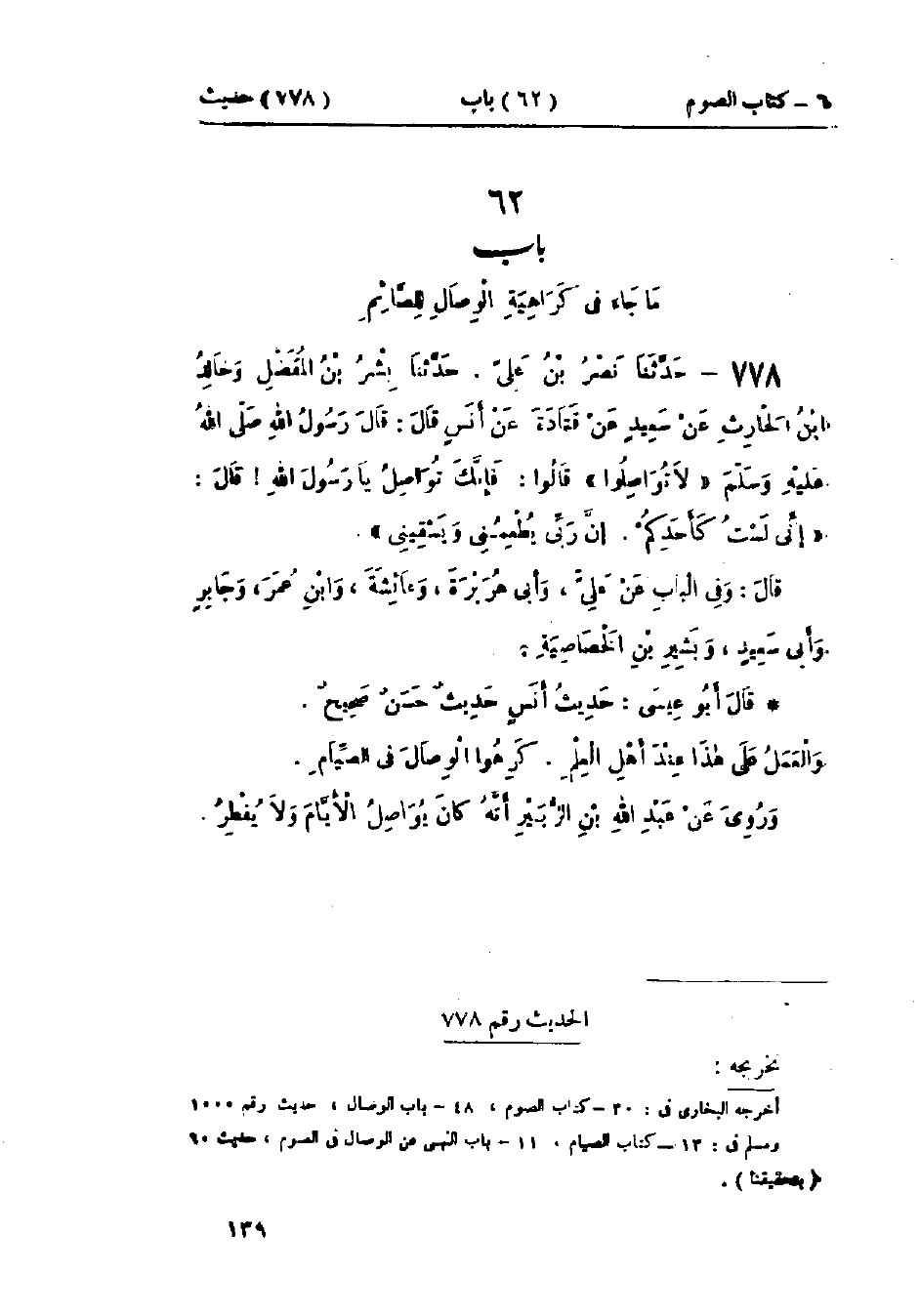 778 - حَدَّثَنَا نَصْرُ بْنُ عَلِيٍّ قَالَ: حَدَّثَنَا بِشْرُ بْنُ المُفَضَّلِ، وَخَالِدُ بْنُ الحَارِثِ، عَنْ سَعِيدٍ، عَنْ قَتَادَةَ، عَنْ أَنَسٍ قَالَ: قَالَ رَسُولُ اللَّهِ صَلَّى اللَّهُ عَلَيْهِ وَسَلَّمَ «لَا تُوَاصِلُوا»، قَالُوا: فَإِنَّكَ تُوَاصِلُ يَا رَسُولَ اللَّهِ، قَالَ: «§إِنِّي لَسْتُ كَأَحَدِكُمْ، إِنَّ رَبِّي يُطْعِمُنِي وَيَسْقِينِي» وَفِي البَابِ عَنْ عَلِيٍّ، وَأَبِي هُرَيْرَةَ، وَعَائِشَةَ، وَابْنِ عُمَرَ، وَجَابِرٍ، وَأَبِي سَعِيدٍ، وَبَشِيرِ ابْنِ الخَصَاصِيَةِ.: «حَدِيثُ أَنَسٍ حَدِيثٌ حَسَنٌ صَحِيحٌ» وَالعَمَلُ عَلَى هَذَا عِنْدَ أَهْلِ العِلْمِ: كَرِهُوا الوِصَالَ فِي الصِّيَامِ "، وَرُوِيَ عَنْ عَبْدِ اللَّهِ بْنِ الزُّبَيْرِ: «أَنَّهُ كَانَ يُوَاصِلُ الأَيَّامَ وَلَا يُفْطِرُ»
